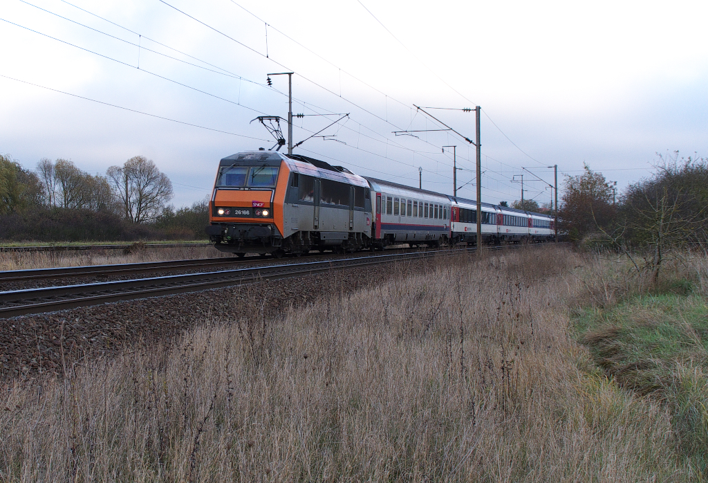 Eine BB 26000 der SNCF schiebt RE 35019, Nancy Ville - Strasbourg, zwischen Reding & Arzviller (kein Halt) am Rhein-Marne-Kanal entlang und wird bald den nächsten Halt Lutzelbourg erreichen. 18.07.2012 Christian Kühn