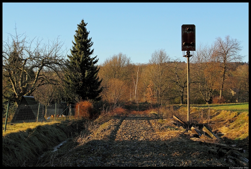 Die Gleise der ehemaligen Bahnstrecke Kamenz - Bischofswerda sind bereits seit Jahren verschwunden, doch das Überwachungssignal eines Bahnübergangs in Kamenz blieb stehen. Der letzte Zug fuhr hier 1996 vorbei. (28.12.2012) Christopher Pätz