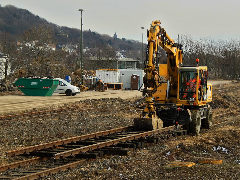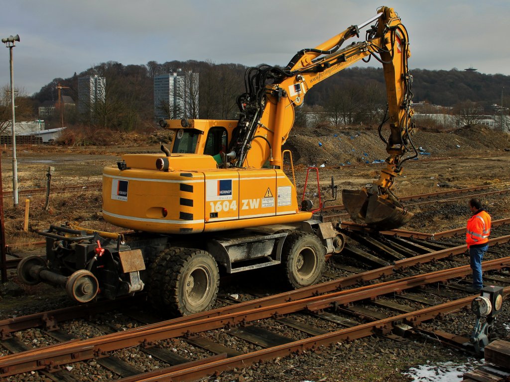 Ein Zweiwegebagger der Firma Hering Gleisbau Gmbh zieht am 21.02.2012 rückwärts fahrend ein Gleisjoch über die Gleise in Aachen West. Die Schienen über die der Bagger fährt sind schon bis auf den Schienenkopf durchtrennt und werden nun Stück für Stück von dem Bagger ausgebaut und zu dem Lagerplatz geschleppt, wo sie demontiert und recycelt werden. Mario Schürholz