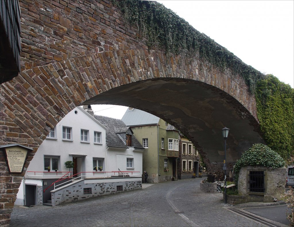 Mitten in Bruttig-Fankel steht die größte "Soda-Brücke" der geplanten Strecke (Koblenz -) Treis - Karden - Bullay (Rechte Moselstrecke), DB-Streckennummer 3113, diese Bogenbrücke (Höhe 10 m, Breite 8 m, Spannweite 24 m) war der größte Rundbogen, der bis 1920 im Eisenbahnbau erstellt wurde; 15.04.2012