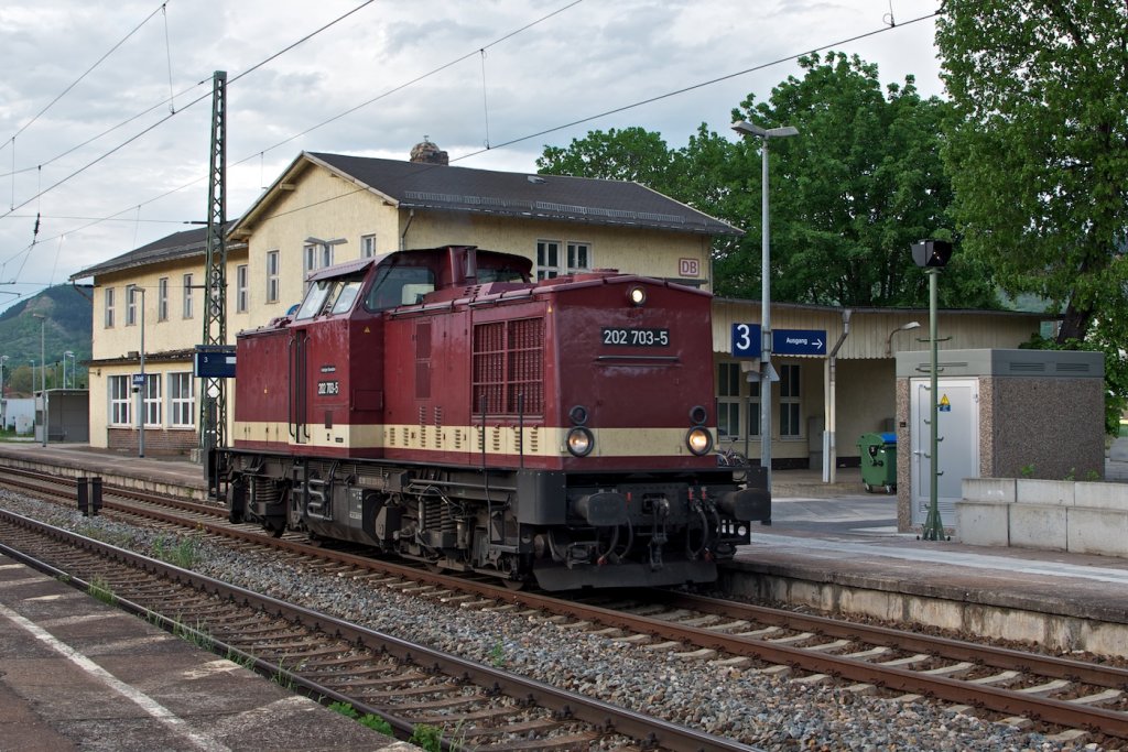 202 703 der Leipziger Eisenbahn, tauchte am 11. Mai 2012 plötzlich in Göschwitz und bot nach dem Umsetzen vom Geraer Gleis Gelegenheit, von allen Seiten in Augenschein genommen zu werden, bevor sie in Richtung Saalfeld entschwand... Andreas Göpfert