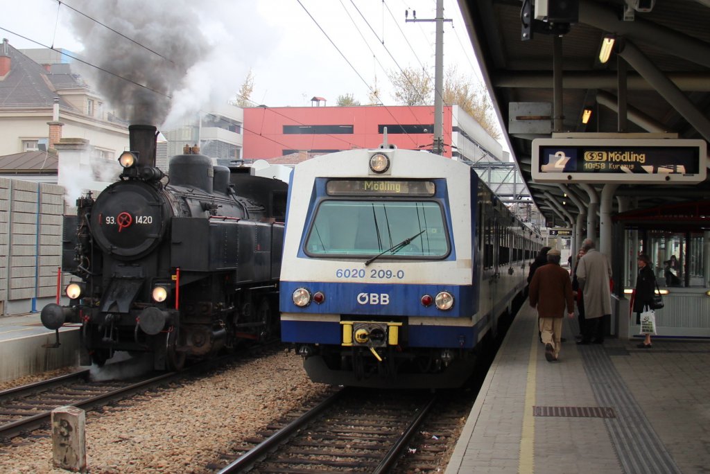 4020 209 als S9 29415 von Gänserndorf (Gae) nach Mödling (Md) zu sehen im Bahnhof Liesing (Lg), daneben wartet 93 1420 Anschlussreisende aus der Schnellbahn ab, die Sonderfahrt geht nach Waldmühle (Wam); am 11.11.2012 Florian Kubele