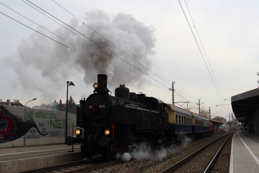 93 1420 mit dem Sonderzug von Wien Meidling (Mi) nach Waldmühle (Wam) in der Haltestelle Wien Atzgersdorf (Az H1), dahinter 2062 053; am 11.11.2012 Florian Kubele