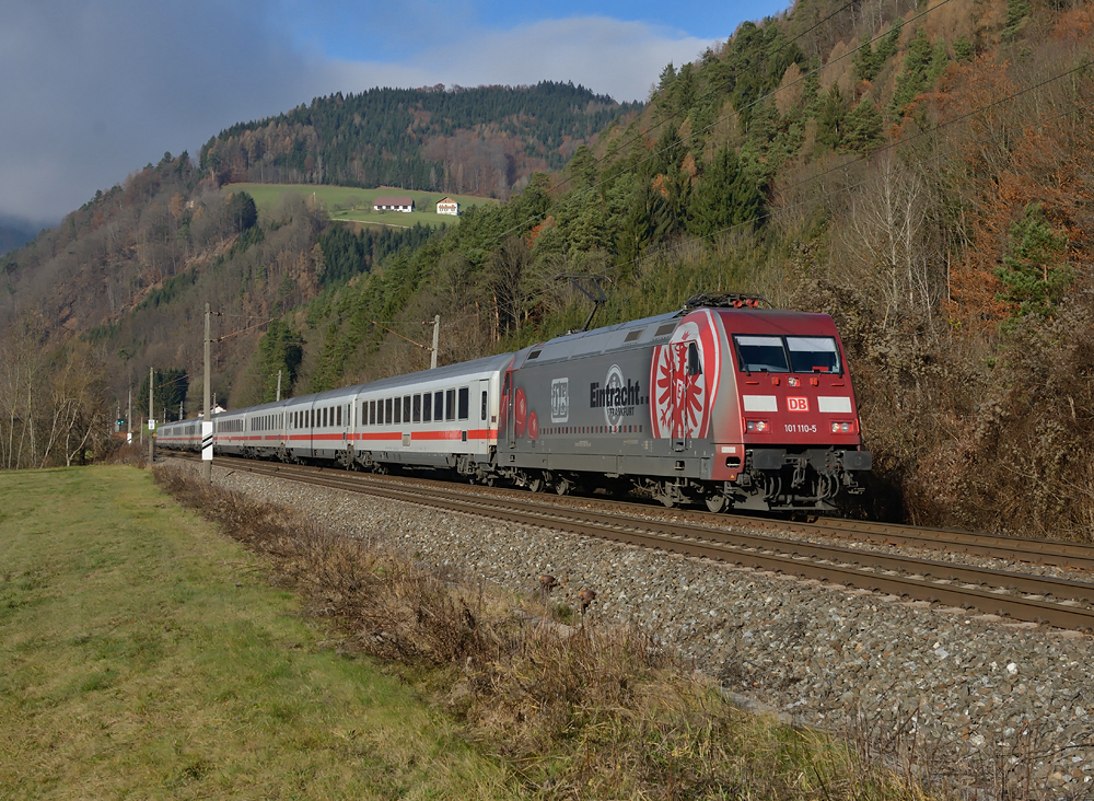 Die für der Fußballverein Eintracht Frankfurt werbende 101 110 war am 25.11. als IC 719 von Salzburg nach Graz unterwegs, und wurde von mir bei Pernegg fotografisch festgehalten. Kriwetz Lukas