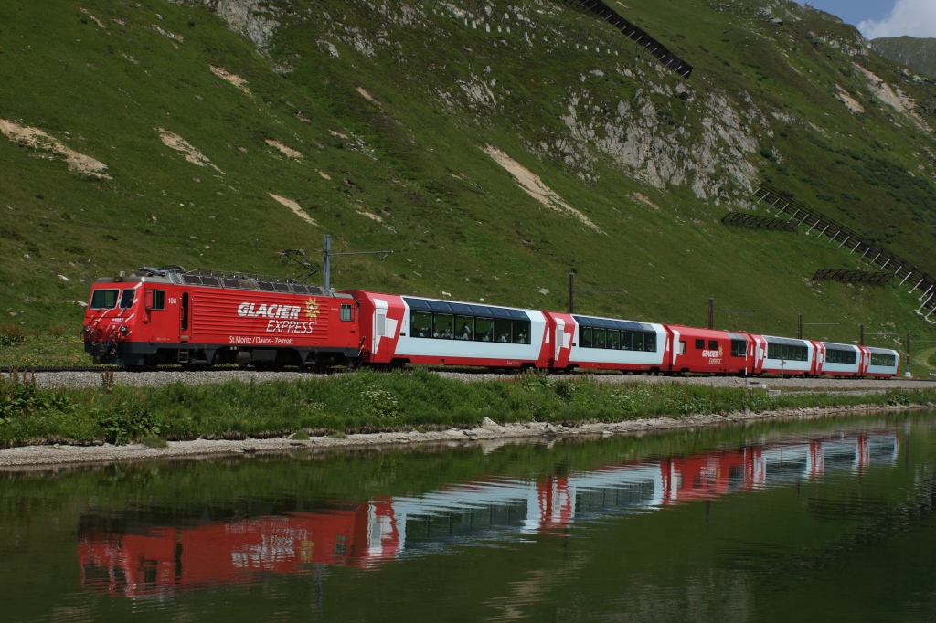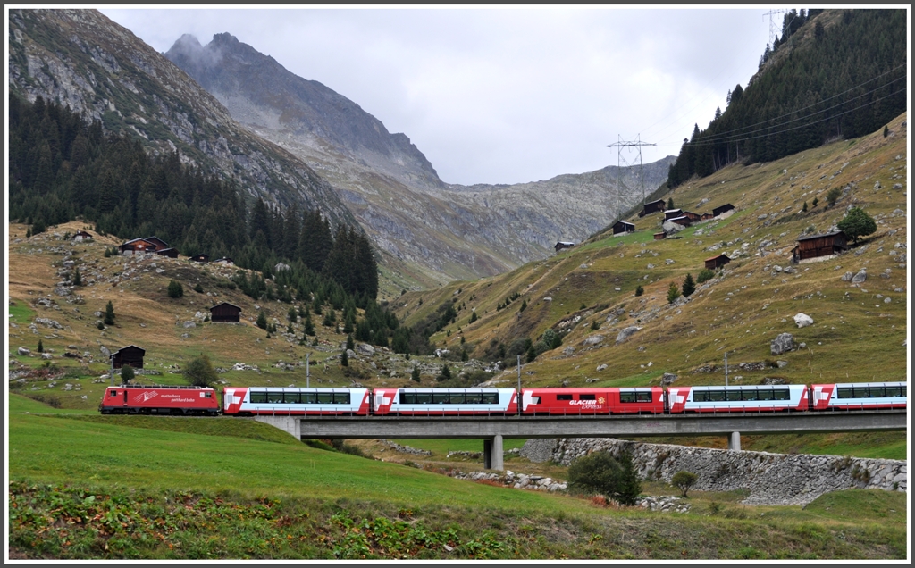 GlacierExpress 906 steht bereits auf Gleis 3 und jetzt folgt dahinter der zweite Zugsteil 908. Nachdem die MGB Lok weggestellt wurde, werden beide Zugsteile vereinigt und fahren gemeinsam weiter nach Chur. (25.09.2012) Herbert Graf