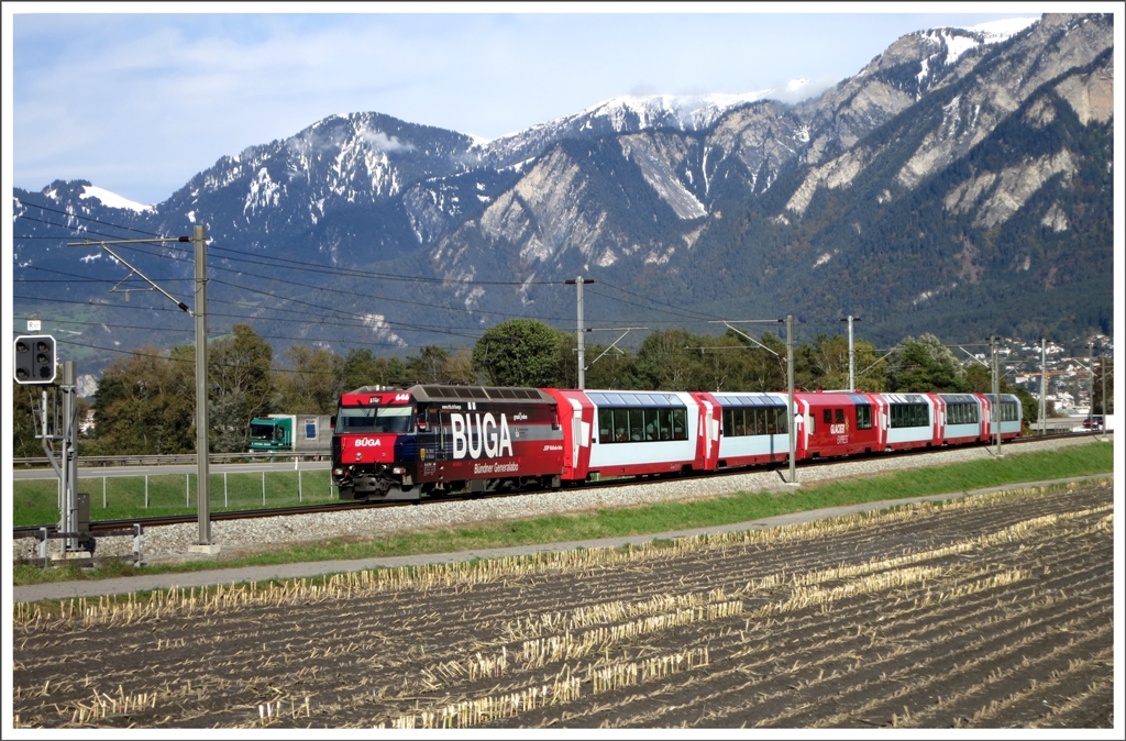 GlacierExpress 908 nach St.Moritz mit Ge 4/4 III 646 "Sta.Maria-Val Müstair" zwischen Chur West und Felsberg. (17.10.2012 mit erstem Schnee im Hintergrund) Herbert Graf