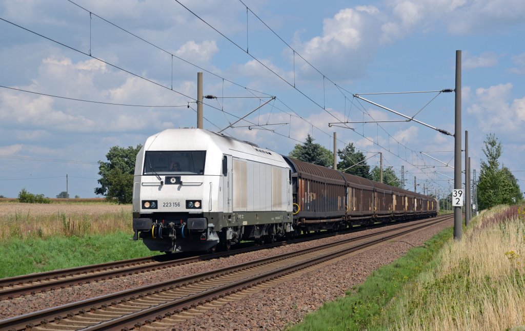 223 156 zog am 11.07.12 einen Enercon-Zug von Riesa kommend durch Radegast Richtung Leipzig.