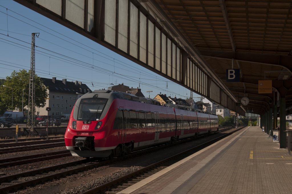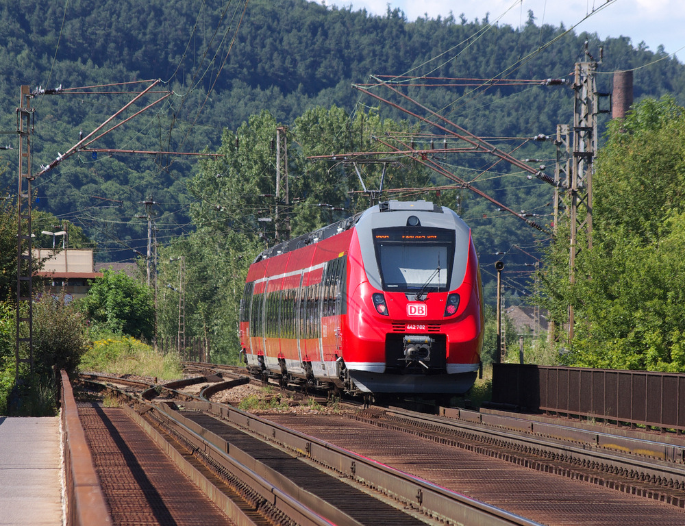 442 202 RB Trier - Koblenz hat die Moselbrücke bei Pfalzel überquert und fährt in Bahnhof von Pfalzel ein.