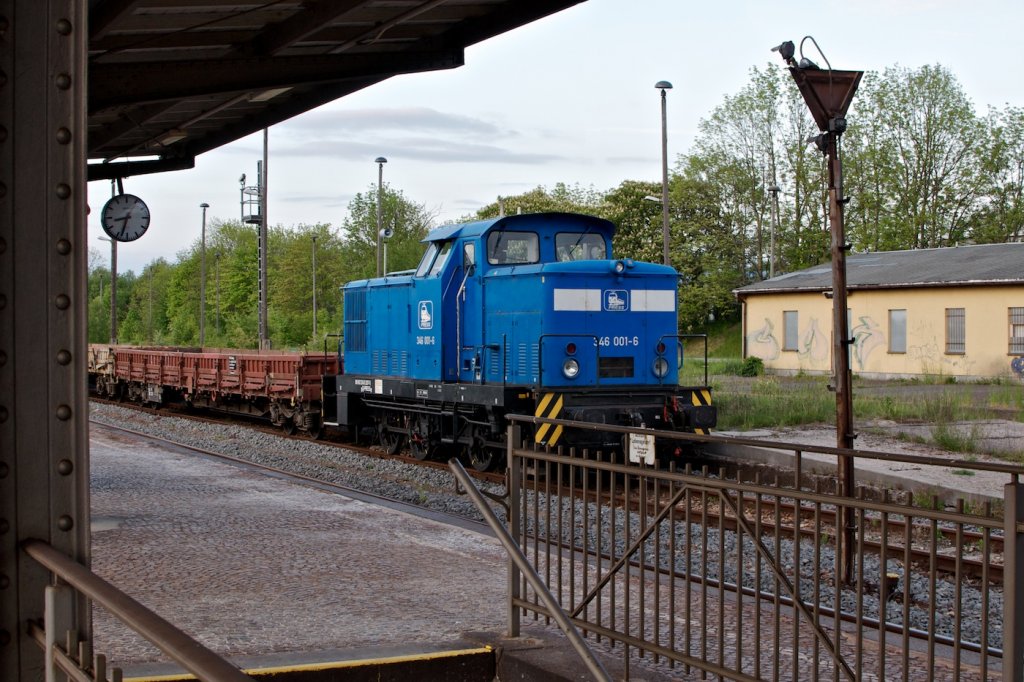 Zwischen 6. und 20. Mai 2012 fanden Gleisbauarbeiten zwischen Neustadt (Orla) und Oppurg statt. PRESS 346 001 ruht sich am Abend des 18. Mai nach getaner Arbeit im Bahnhof Triptis aus. Andreas Göpfert