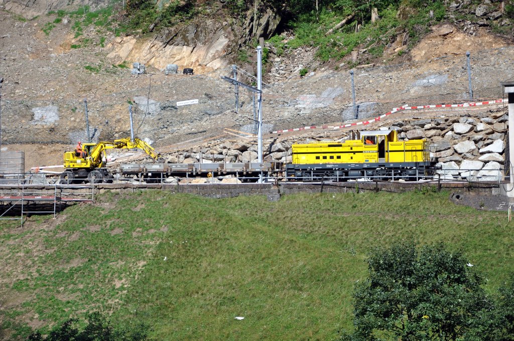 Em 9885 5847 011-4 der Holcim Zementwerke in Untervaz-Trimmis. Die Lok befindet sich hier im Übergabebahnhof, dahinter schwingt sich die neue RhB Brücke über die SBB Doppelspur Chur-Landquart. (29.03.2012) Herbert Graf