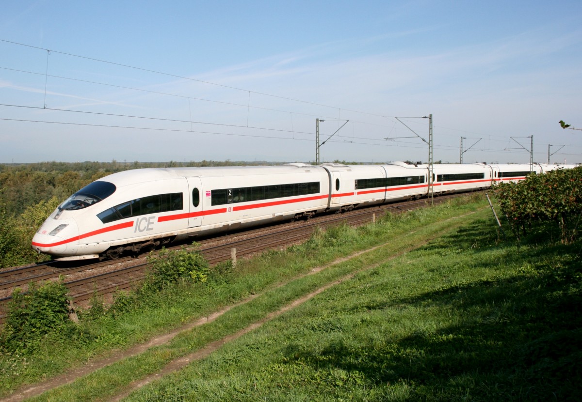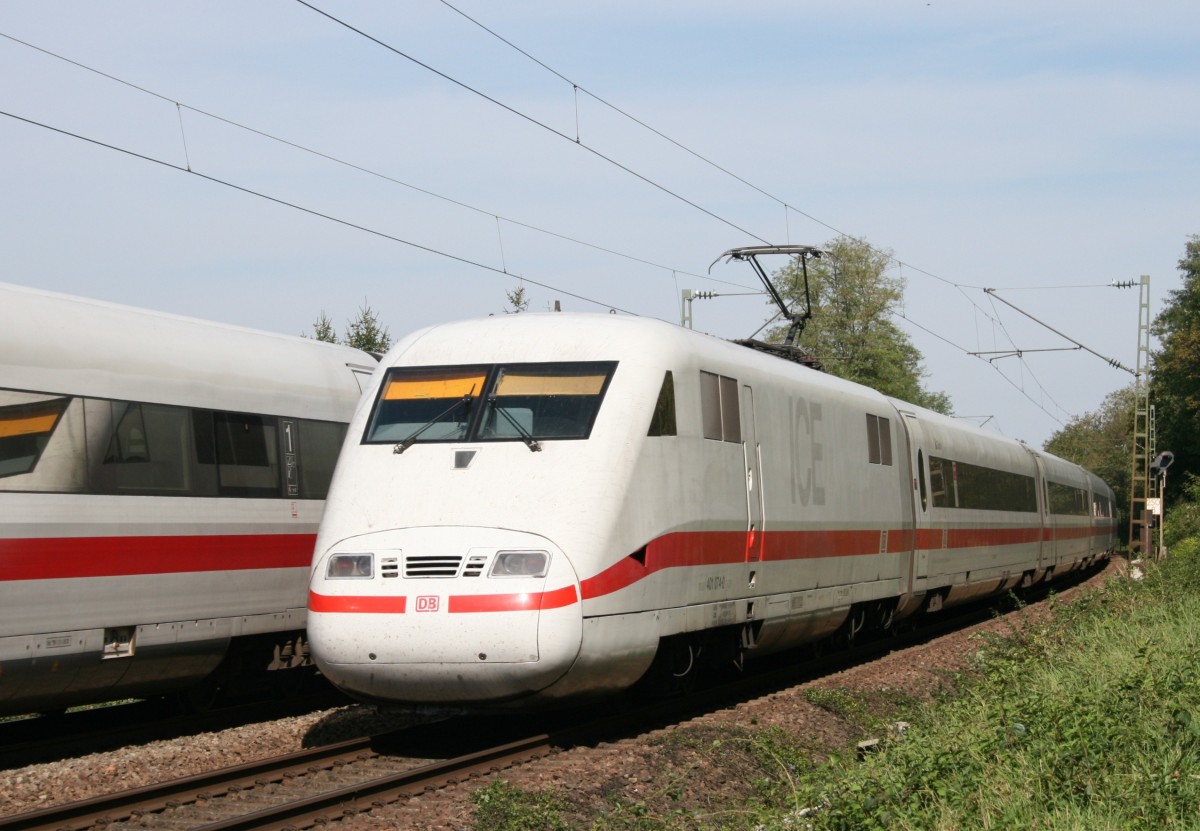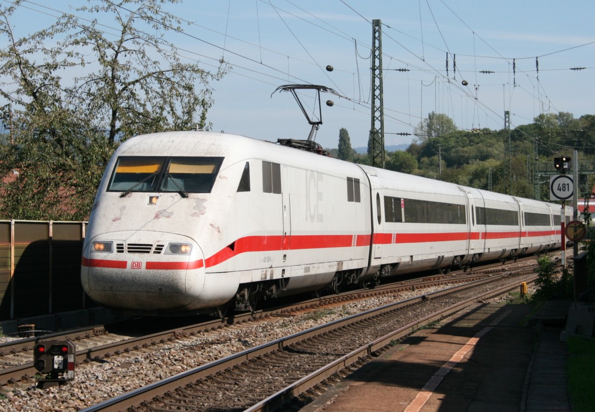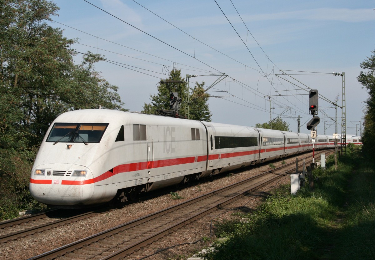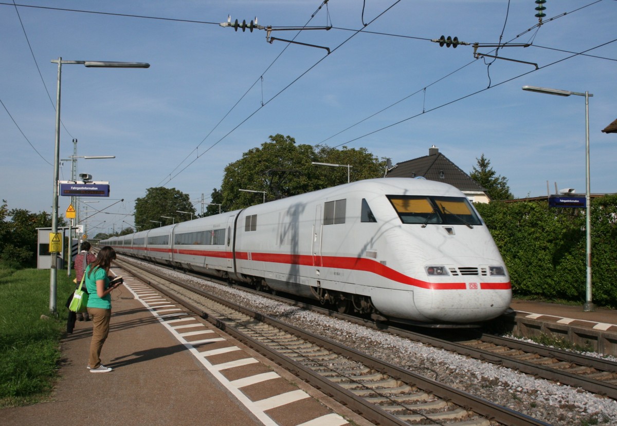 401 074 als ICE 374 (Interlaken Ost–Berlin Ostbahnhof) zwischen Kleinkems und Rheinweiler, links ICE 71 (Hamburg-Altona–Basel SBB); wo sich am 21.09.2012 noch zwei ICE begegnen, ist heute kein planmäßiger Fernverkehr mehr anzutreffen, da dieser seit Dezember 2012 zwischen Schliengen und Haltingen durch den Katzenbergtunnel geführt wird. Gustav Richard
