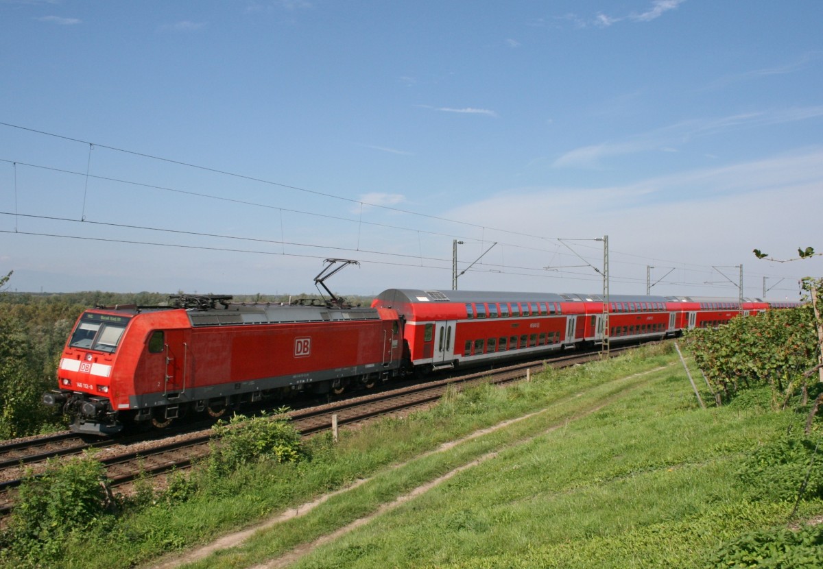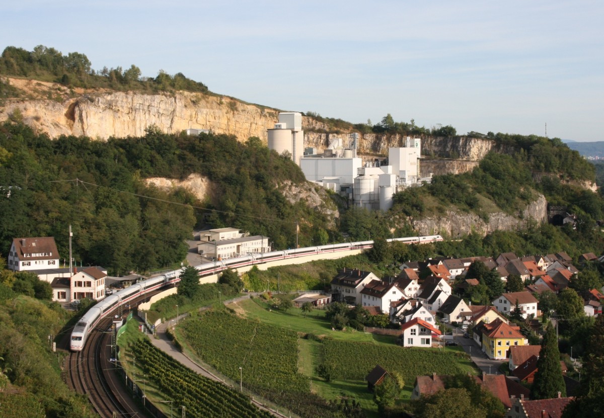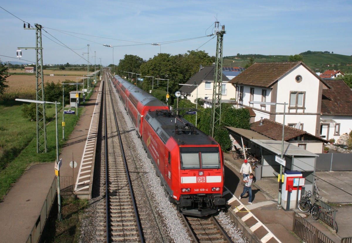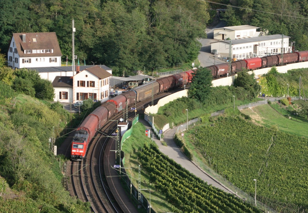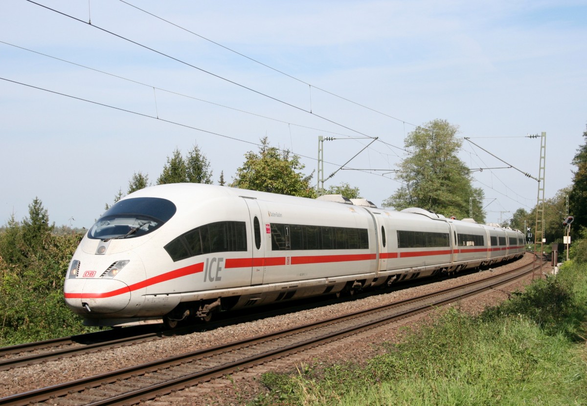 401 074 als ICE 374 (Interlaken Ost–Berlin Ostbahnhof) zwischen Kleinkems und Rheinweiler, links ICE 71 (Hamburg-Altona–Basel SBB); wo sich am 21.09.2012 noch zwei ICE begegnen, ist heute kein planmäßiger Fernverkehr mehr anzutreffen, da dieser seit Dezember 2012 zwischen Schliengen und Haltingen durch den Katzenbergtunnel geführt wird. Gustav Richard
