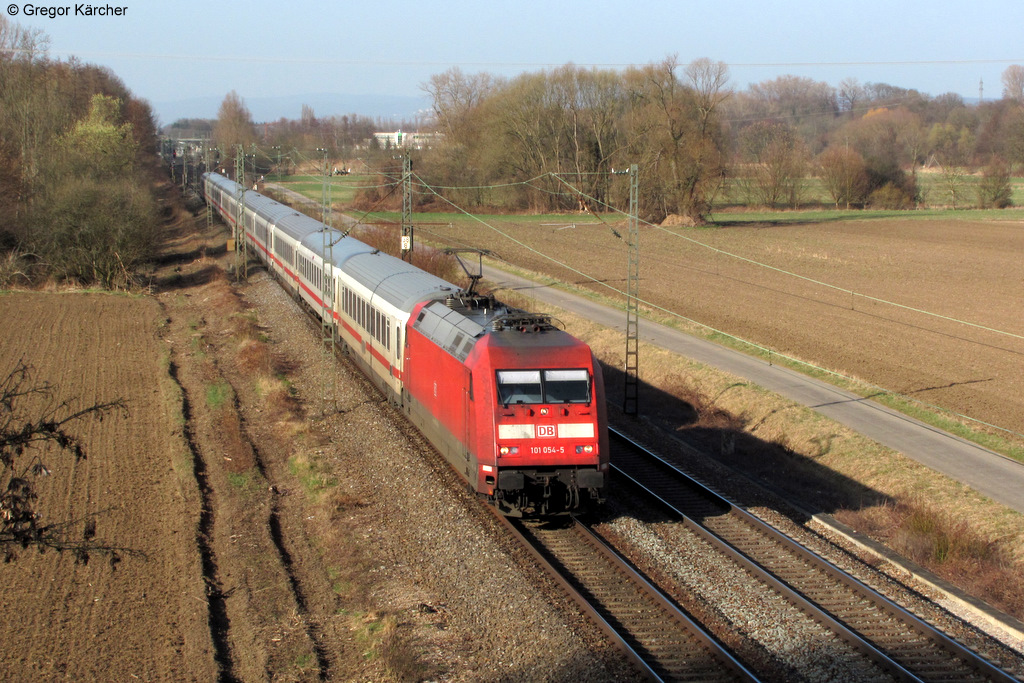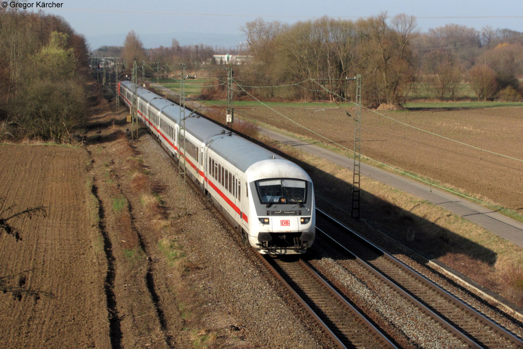 Am 03.03.2012 war auf der 701 wieder ein Ersatzzug unterwegs. IC 2801 (Frankfurt (Main) Hbf - Konstanz) verkehrte als Ersatz für den ausgefallenen IC 2371 "Schwarzwald". Schublok ist 120 101-1. Aufgenommen am 03.03.2012 zwischen Weingarten und Karlsruhe-Durlach. Gregor Kaercher