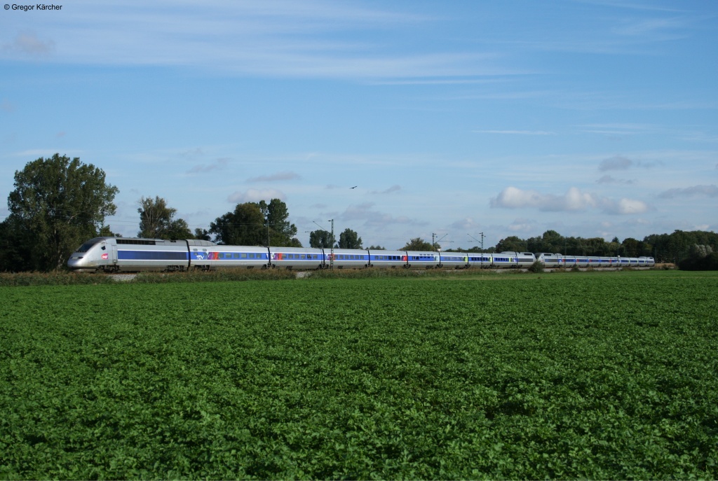 Insgesant fünfmal im Jahr 2012 gab es immer morgens einen TGV-Vollzug auf deutschen Schienen. Das Bild entstand am 28.09.2012 zwischen Karlsruhe-Durlach und Weingarten und zeigt den TGV 9571 (Paris-Stuttgart) mit dem "Wiesn" TGV 9591 (Paris-München). Die Flügelung des Zuges fand in Vaihingen (Enz) statt. Diese SNCF-Triebzüge werden hier bald Geschichte sein, denn jetzt zum Fahrplanwechsel 2012 wird der POS Süd Paris-Stuttgart auf den doppelstöckigen TGV Euroduplex umgestellt. Gregor Kaercher