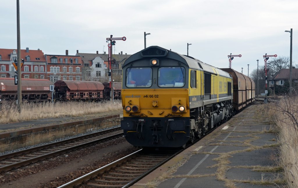 Mittlerweile hat die Class 66 ans andere Zugende umgesetzt und wird nun ihren Zug zum Kraftwerk Meuselwitz befördern. Am 25.02.12 wartet sie in Zeitz auf die Abfahrt. Martin Schneider