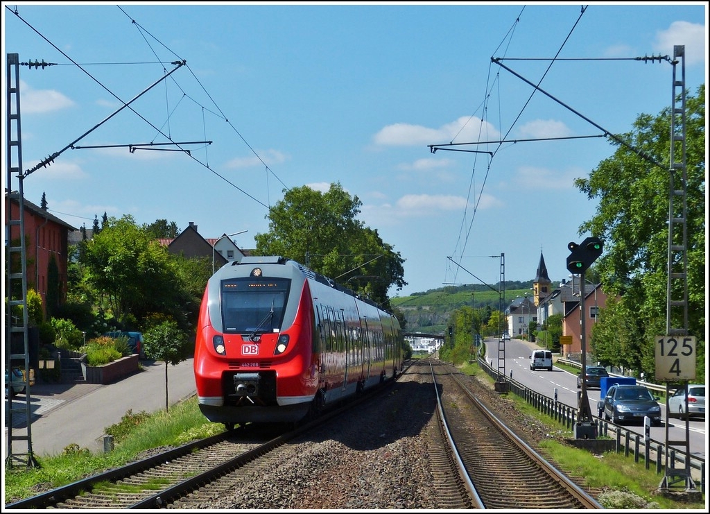 - Hamsterbegegnung - An der schönen Obermoselstrecke (KBS 692) fuhr am 10.08.2012 der Triebzug 442 208 auf seiner Reise von Perl nach Wittlich in den Bahnhof von Oberbillig ein. Das Bild wurde vom Bahnsteig aus gemacht. (Hans) De Rond Hans und Jeanny