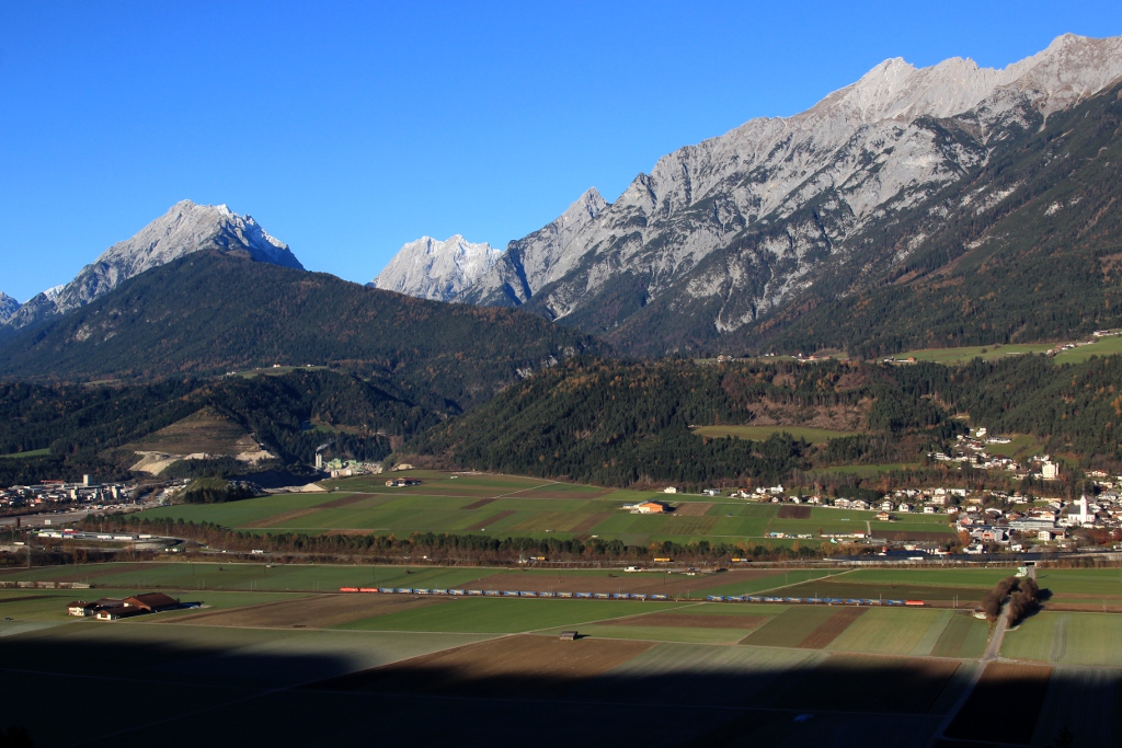 Am 17.11.12 fährt der LKW Walter KLV bespannt mit einer 1216 und einer 1x16 und geschoben von einer 1144 durchs Unterinntal. Hier ist der gesamte Zug bei Schwaz zu sehen. C. Eisenschink