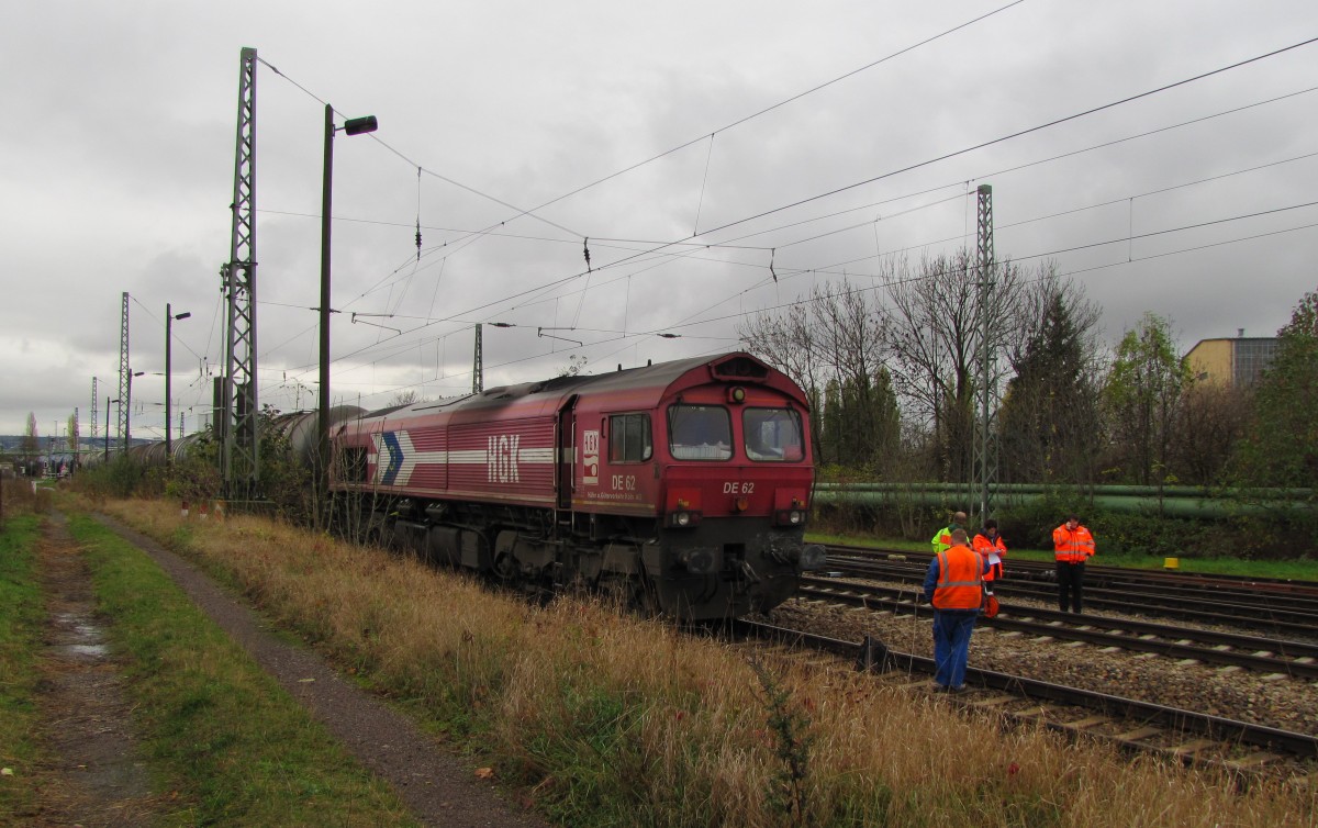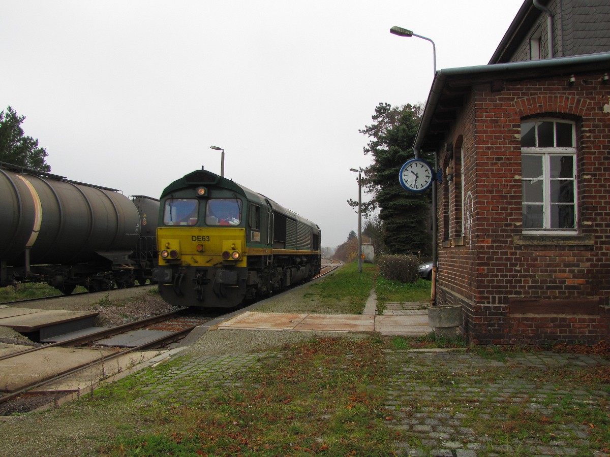 RheinCargo DE 63 zieht am 15.11.2013 Kesselwagen aus dem Tanklager Emleben, um sie für die Fahrt nach Großkorbetha im Bahnhof bereitzustellen. Frank Thomas