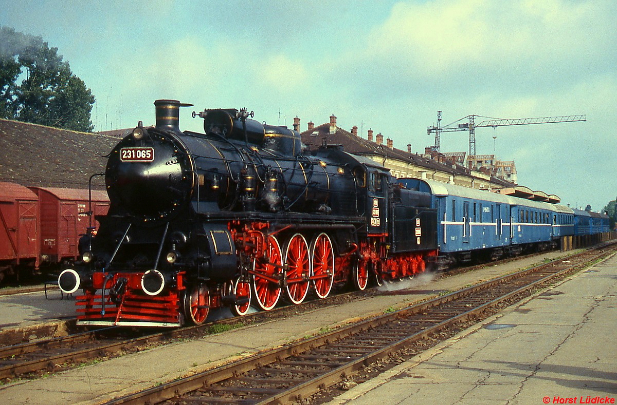 Die frisch hauptuntersuchte 231.065 steht im Juli 1995 mit einem Sonderzug abfahrbereit im Bahnhof Sibiu/Hermannstadt. Das Äußere verrät, dass die 2'C1'h4-Maschine auf eine Konstruktion aus dem Hause Maffei zurückgeht, die 231.065 wurde allerdings von Henschel 1922 (Fabrik-Nr. 18999) gebaut. Horst Lüdicke