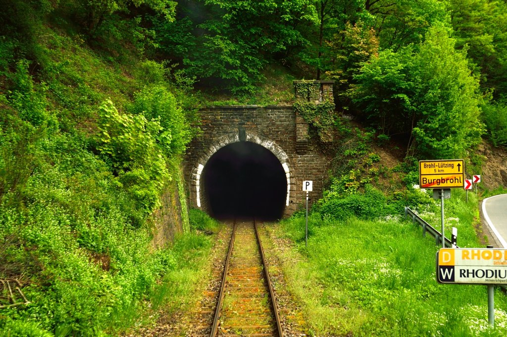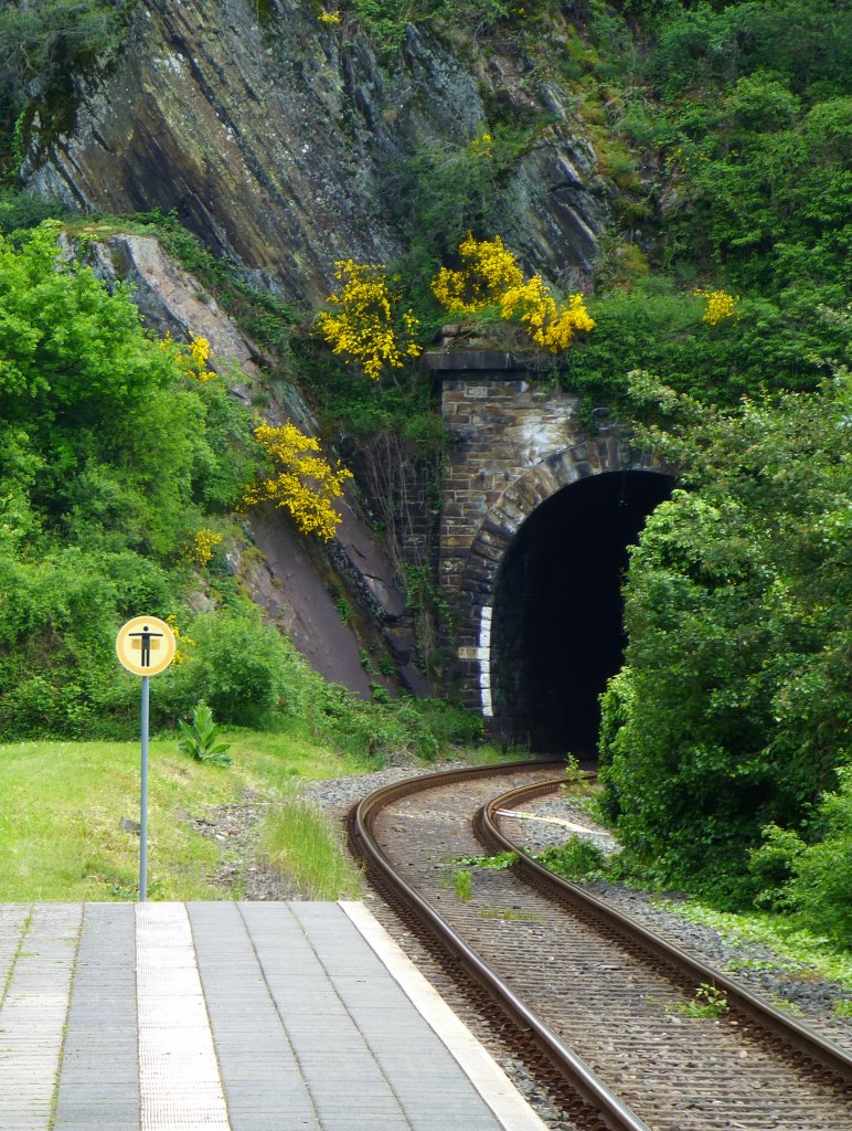 Deutschland, Rheinlandpfalz, Landkreis Ahrweiler, Verbandsgemeinde Altenahr, Bahnhof Mayschoss an der Ahrtalbahn (KBS 477), Ausfahrt in Richtung Bad Neuenahr durch den Saffenberg-Tunnel der aus zwei Röhren besteht. Die 219 Meter lange südliche Röhre wird von der Ahrtalbahn genutzt. Die 235 Meter lange nördliche Röhre ist Teil des Ahr-Radweges, 27.05.2013