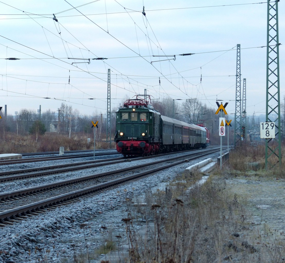 Am 05.12.2013 war E44 044 mit einen Sonderzug nach Hof unterwegs. Am Zugschluss lief 243 005 mit.Anlass war die Eröffnung des elektrifizierten Streckenabschnitt zwischen Plauen und Hof.Fotografiert auf der Zwickauer Olzmannbrücke. Steffen Eule
