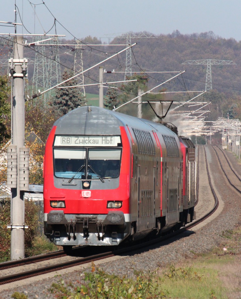 612 982 und 612 984 fahren mit dem RE 3784 nach Nürnberg Hbf durch Zwickau Pölbitz. Der hintere Zugteil beendet seine Reise schon in Hof Hbf. 31.10.2013 Matthias Hartmann