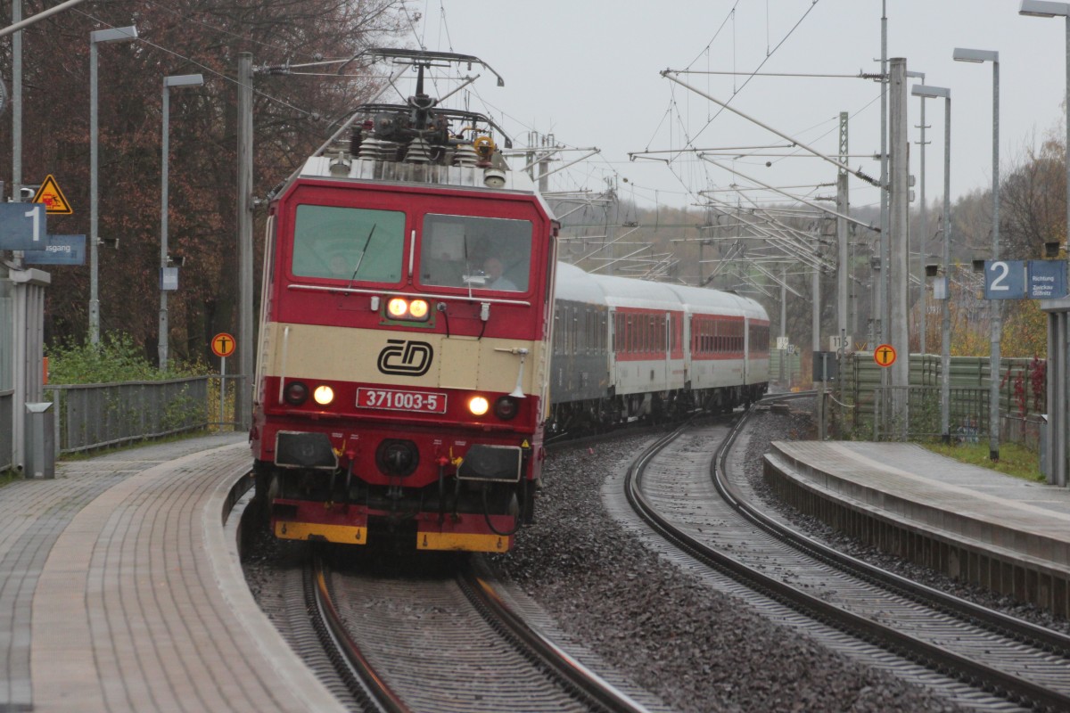 Mit wenigen Minuten Verspätung kommt am 03.11.2013 der CNL 459 mit 371 003-5 aus Richtung Leipzig durch Glauchau Schönbörnchen nach Prag Hbf gefahren. Aufgrund von Bauarbeiten in Dresden ist der Zug über Altenburg, Gößnitz, Chemnitz, nach Dresden gefahren. Nochmal ein netten Gruß zurück zum Tf. Und auch noch ein Dank geht an die Informanten. Denn dadurch wurden diese Aufnahmen von den Sonderleistungen erst möglich. Matthias Hartmann