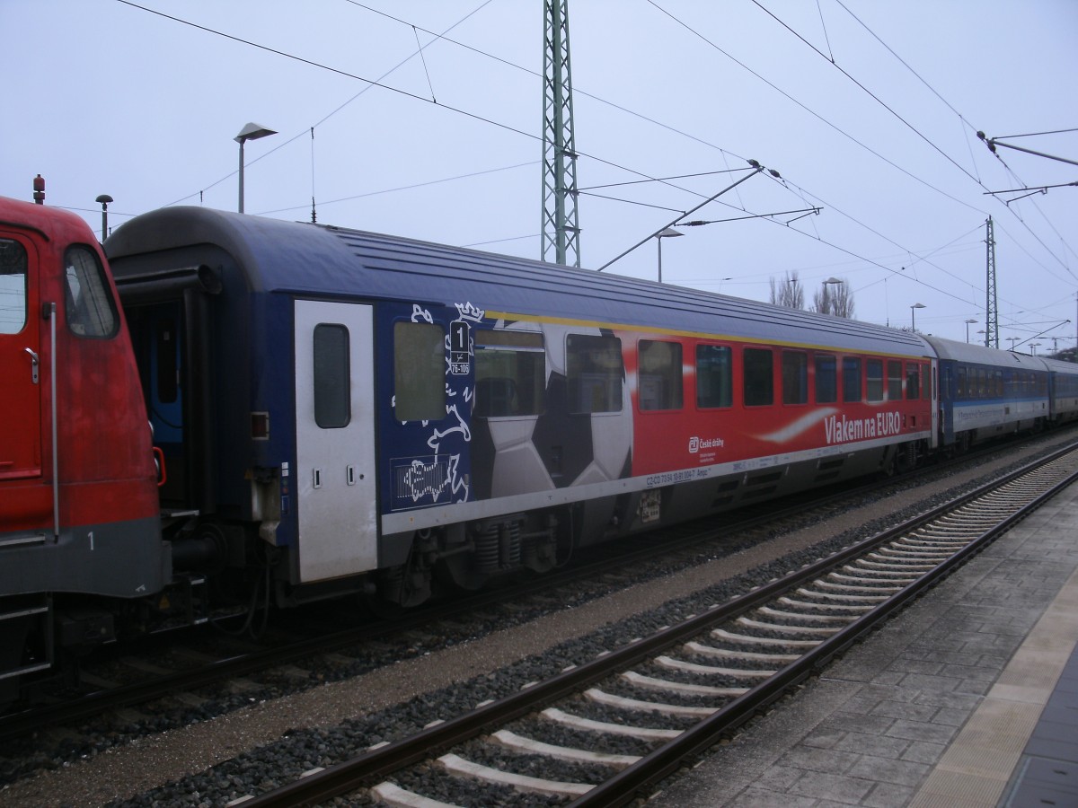 Tschechischer Werbewagen Ampz 73 54 10-91 004-7,im EC 379 Binz-Brno,am 26.Dezember 2013,in Bergen/Rügen.