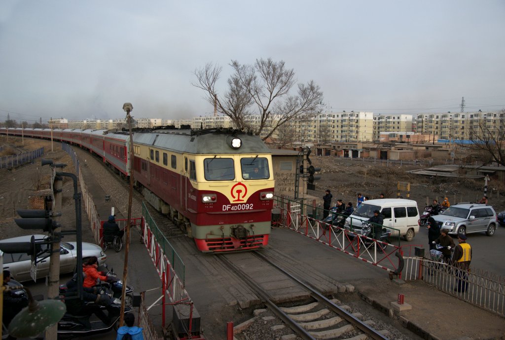 DF4d 0092 dröhnt mit dem Express Nr. 1230 (Lauf: Fuxin - Shanghai) durch die Vororte Fuxins. China, April 2013, Provinz Liaoning
