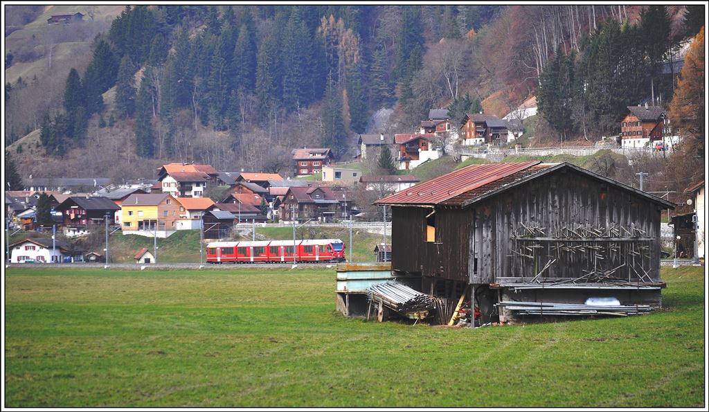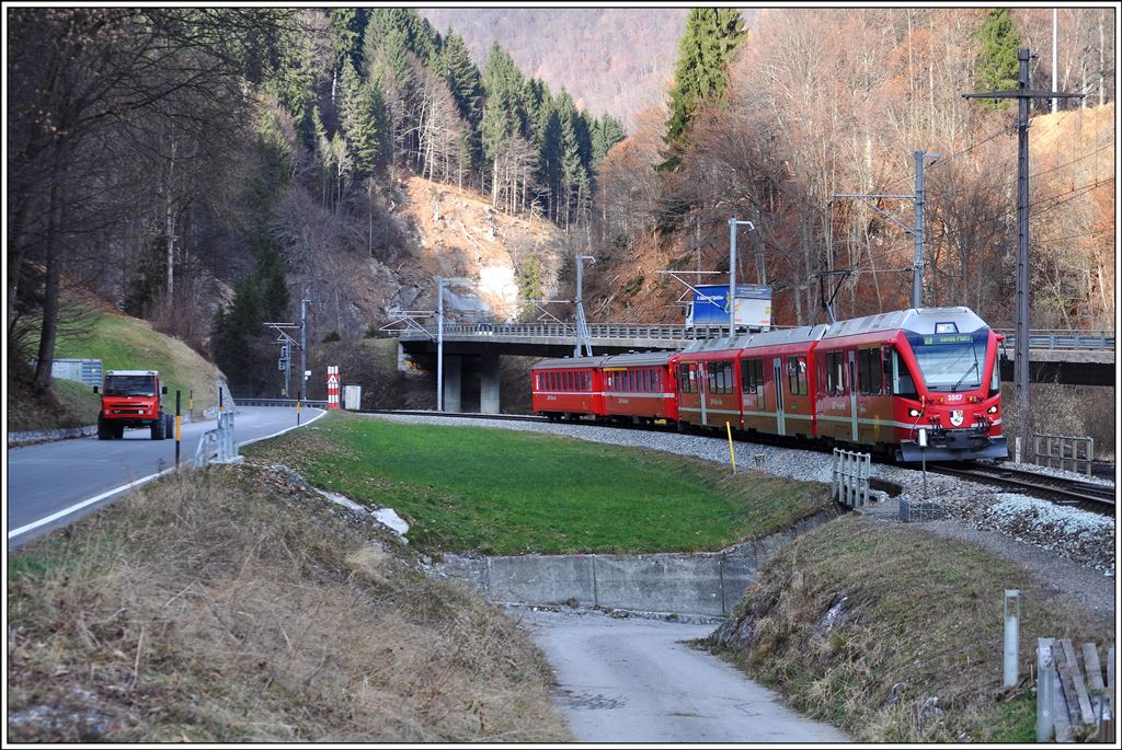 RE1045 mit ABe 8/12 3507 überholt bei der Einfahrt zur Ausweichstelle Fuchsenwinkel ein landwirtschaftliches Fahrzeug, ebenfalls in RhB-rot. (28.11.2013) Herbert Graf