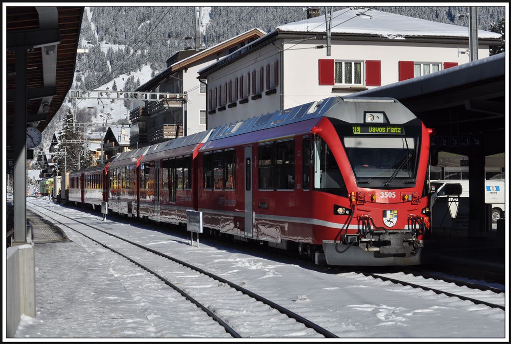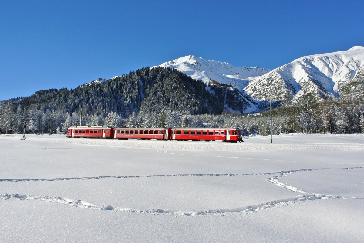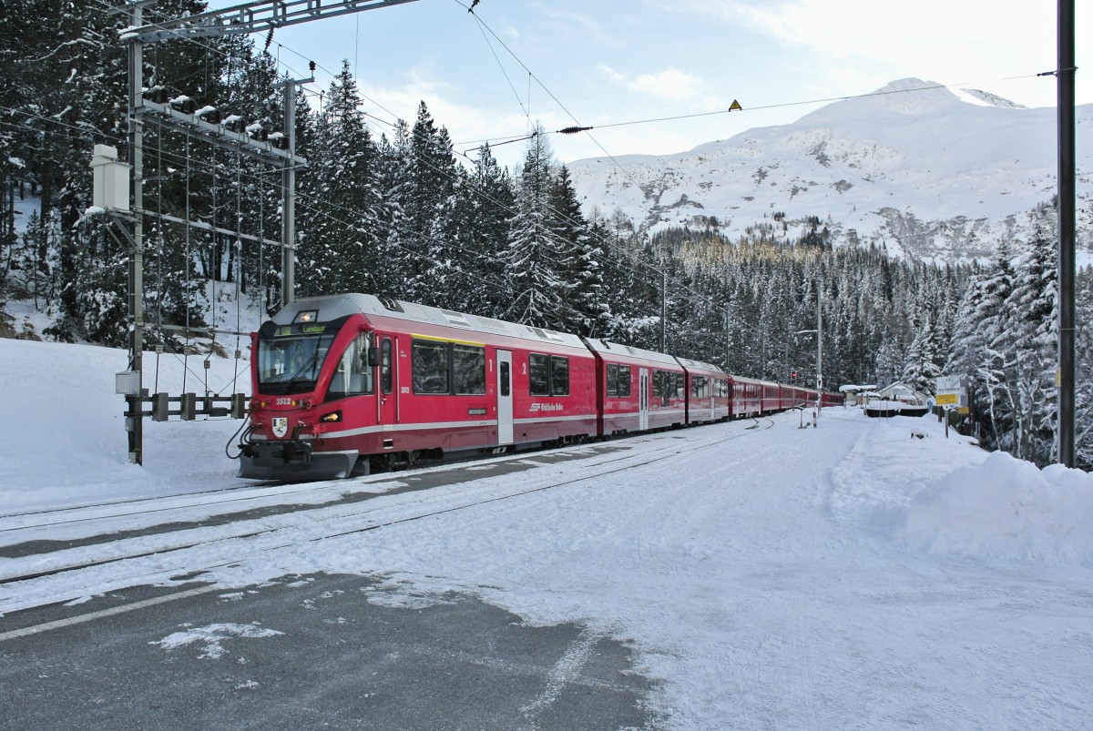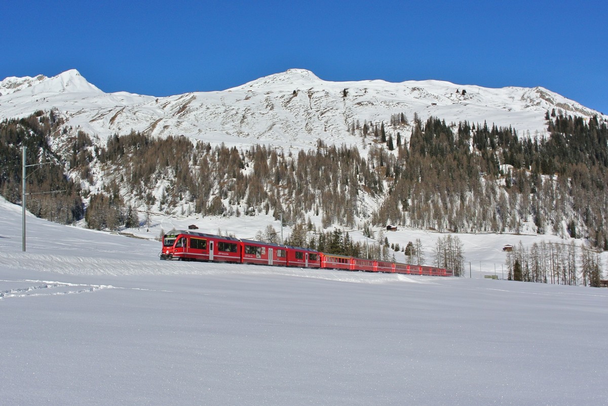 Dank dem Spenglercup Finale wurden die RE Landquart-Davos z. T. stark verlängert. Im Bild ist der RE 1029, bestehend aus dem ABe 8/12 3506, A und 2 B EWI, 4 B Fliegender Rhätier, B und A EWI, Davos Wolfgang, 31.12.2013. Simon Bütikofer