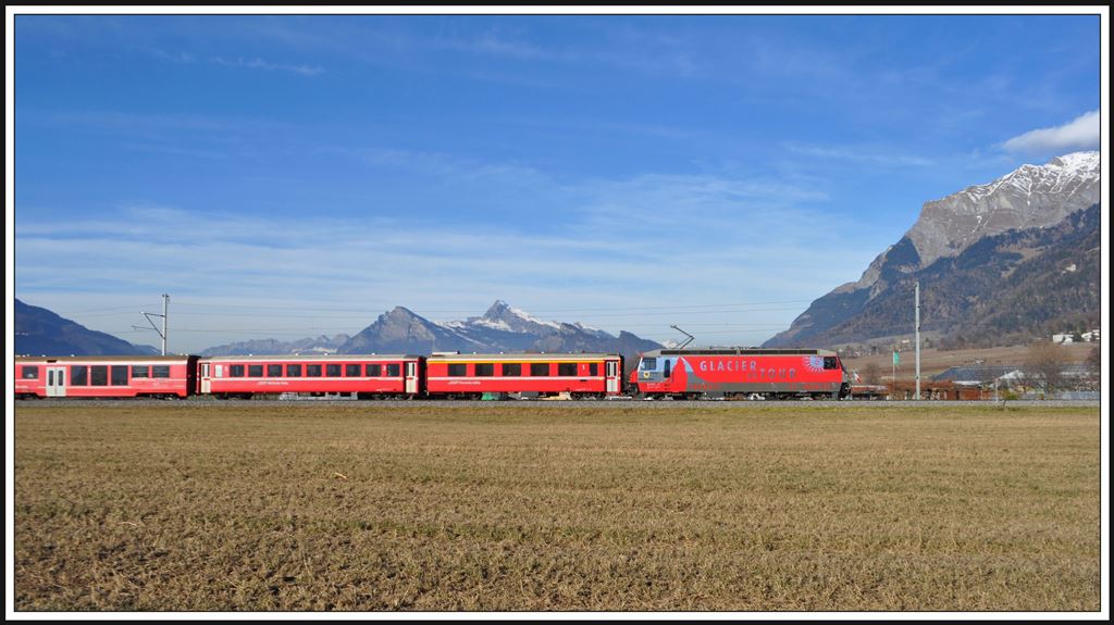 RE1041 nach Davos Platz mit Ge 4/4 III 651 "Fideris" überquert die Ebene zwischen Landquart und Malans. Im Hintergrund sind der Gonzen und die Gauschla zu sehen. (21.12.2013) Herbert Graf