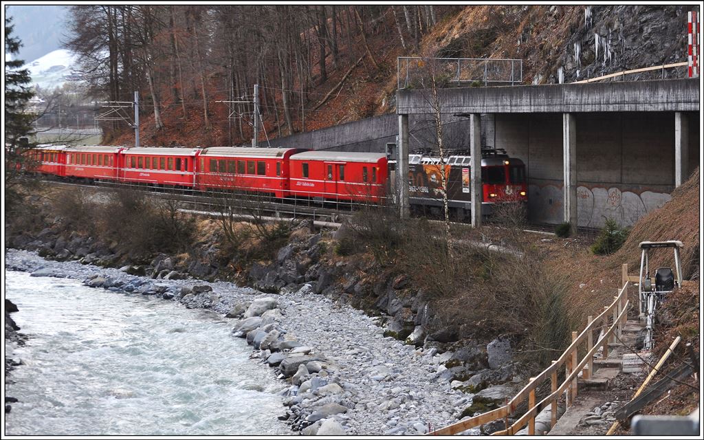Auf der alten Strasse im Fuchsenwinkel gibt's im Winter keine Sonne, dafür umso mehr Eis. RE1040 aus Davos mit ABe 8/12 3503 ist auf dem Weg nach Landquart. (28.11.2013) Herbert Graf