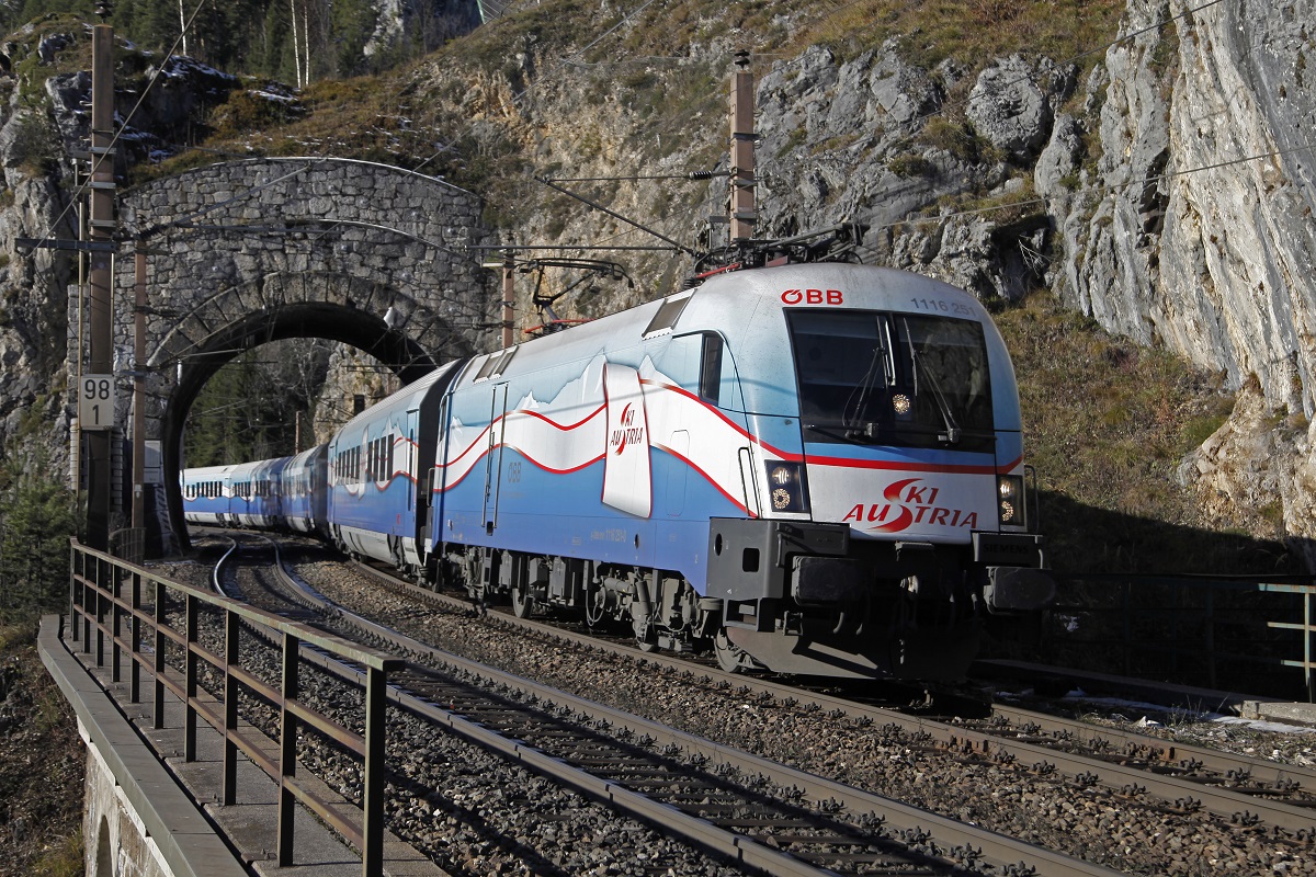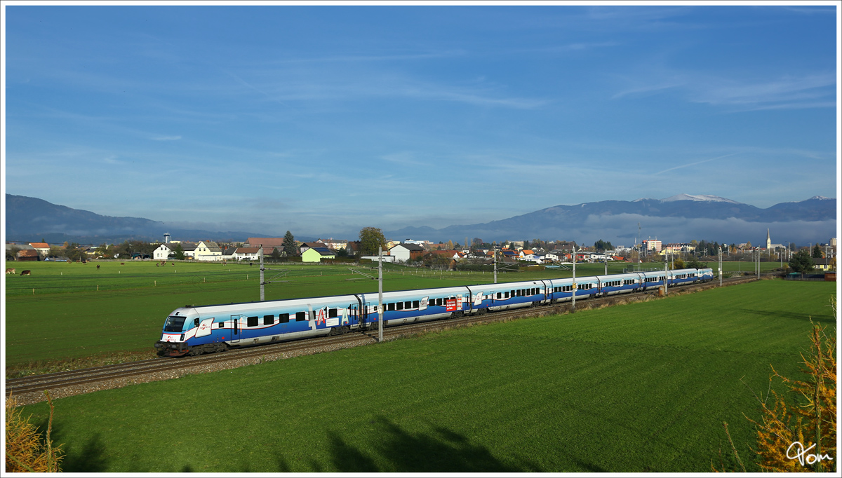 Der neueste Werberailjet 1116 251 "SKI AUSTRIA" fährt als railjet 538 von Villach nach Wien Meidling.