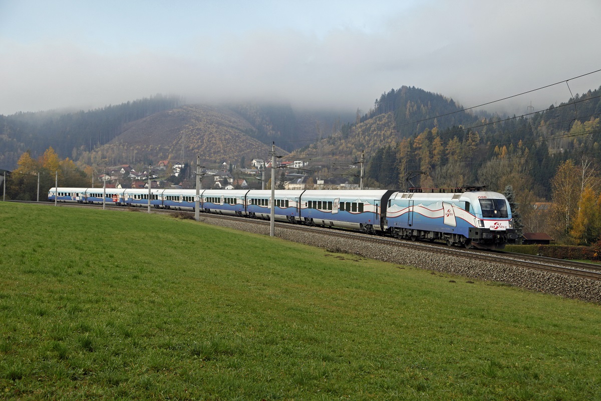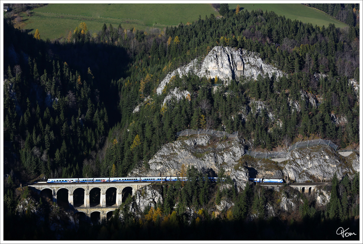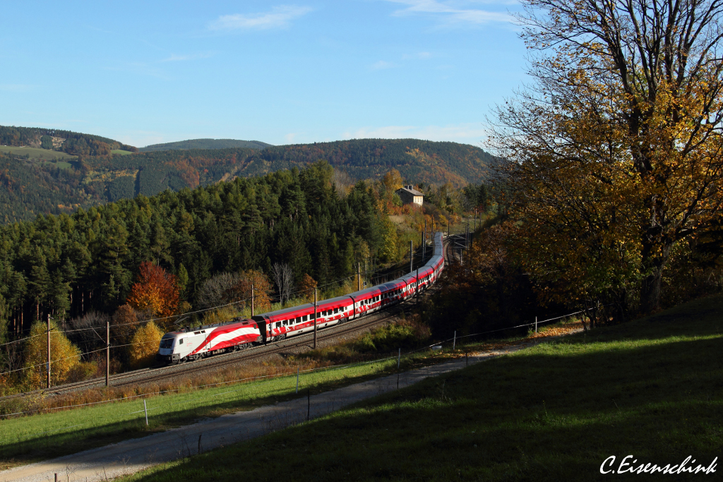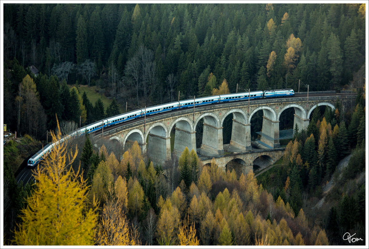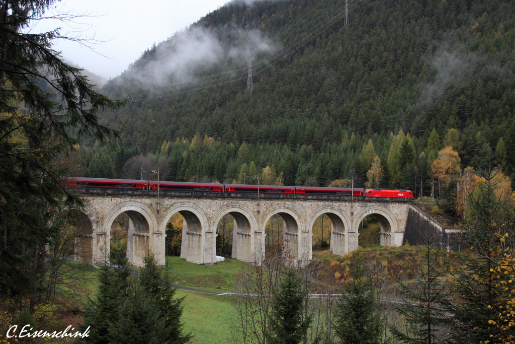 Am 21.10.13 bespannte eine ÖBB 1216 einen Railjet von Wien nach Villach. Hier zeigt sich die sonderliche Fuhre auf dem Adlitzgraben Viadukt bei Breitenstein. C. Eisenschink