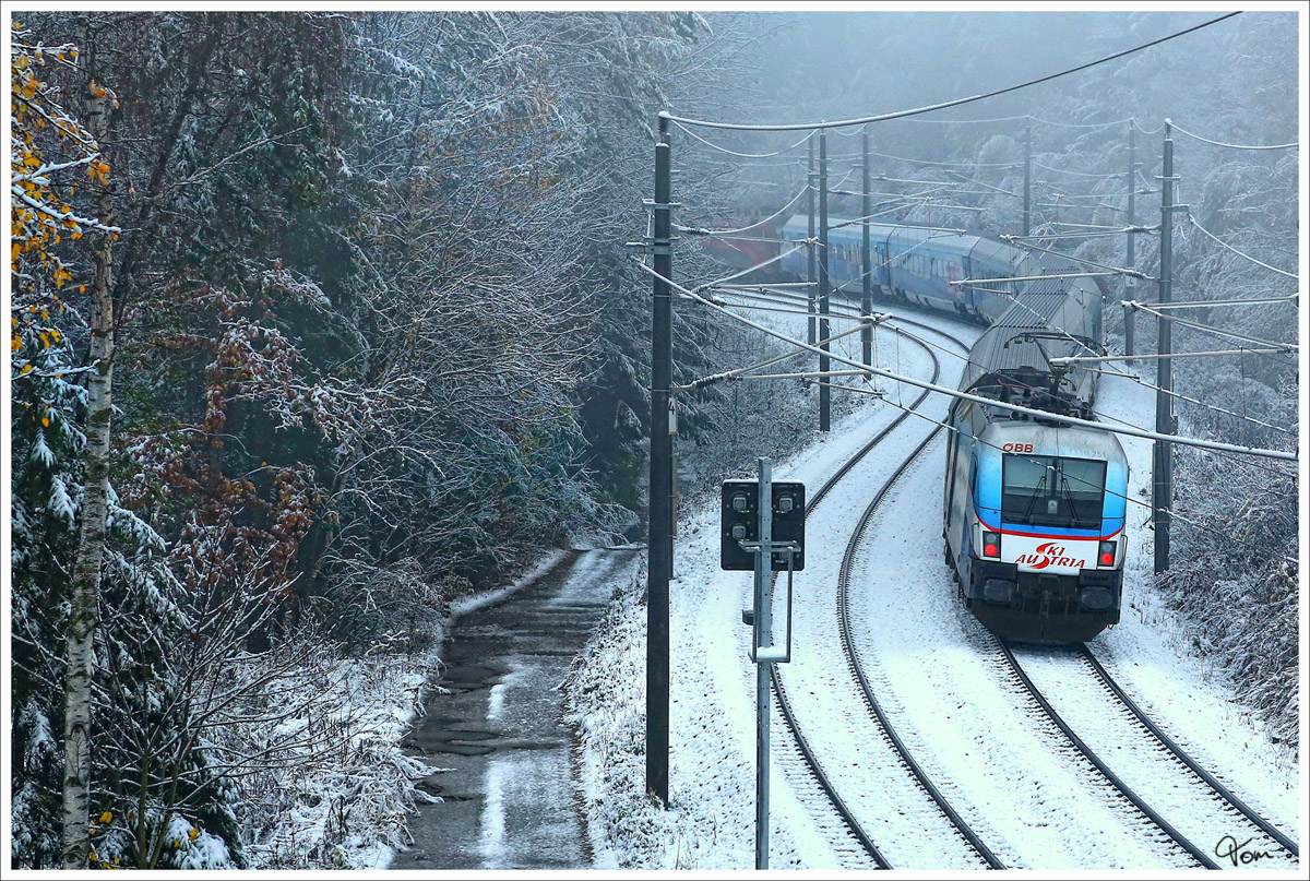 Beim ersten Schnee, schiebt 1116 251 den RJ 531 von Wien Meidling nach Villach. Zeltweg 10.11.2013 Leitner Thomas