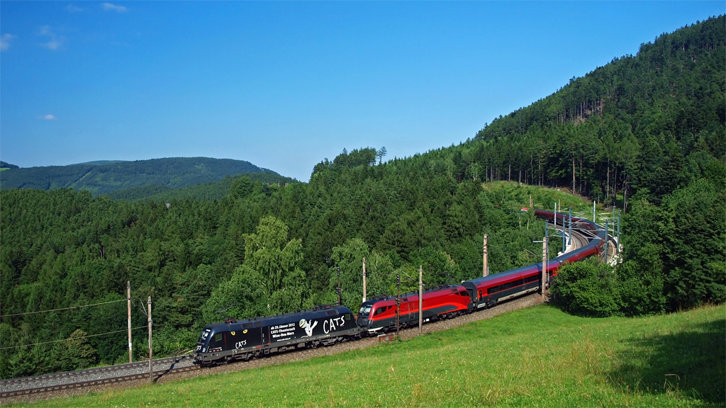 RJ 732 wurde im Fahrplanjahr 2013 planmässig von einer 1116er vor der RailJet Lok gezogen. Grund dafür sind die am Zugschluss mitgeführten Autotransportwagen. Am 08.07.2013 kam die CATs Lok 1116.153 zum Zug, und wurde bei dem bekannten Aussenkurve hinter dem Bahnhof Eichberg am Semmering aufgenommen. Gábor Árva