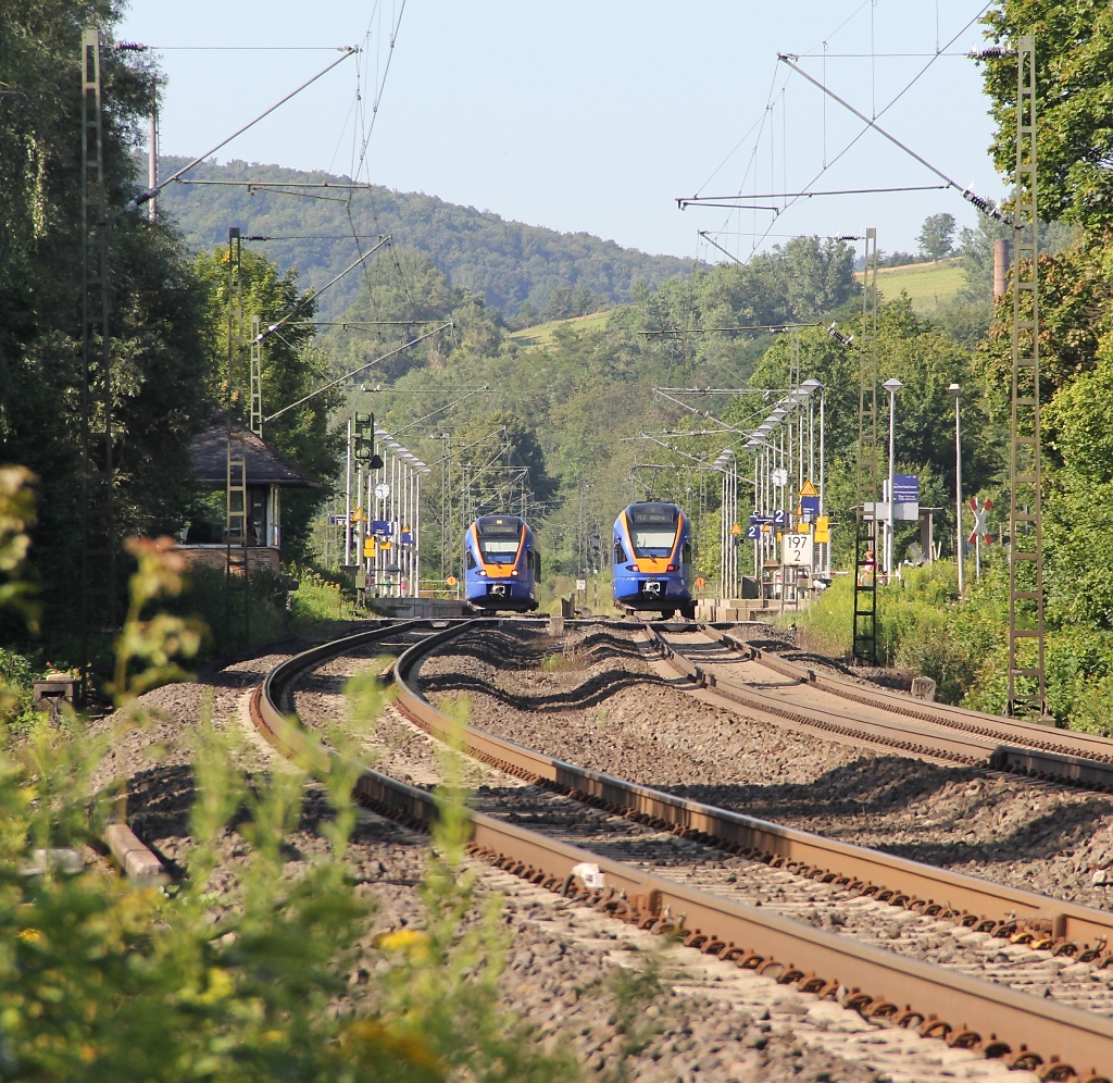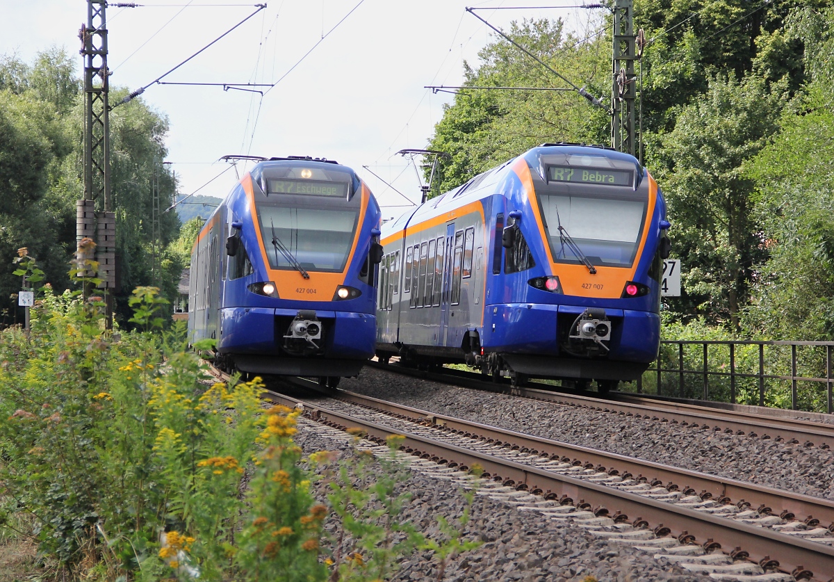 Ab 01. März 2013 wird der Bahnhof Wehretal Reichensachsen zu meinem neuen Berufspendler Start- und Zielbahnhof, wenn ab dann die neue Wahlheimat bezogen wird. Hier treffen sich zwei Cantus Flirts auf der Linie R7 nach und von Göttingen im Bahnhof. Aufgenommen am 01.08.2012. Jens Baumhauer