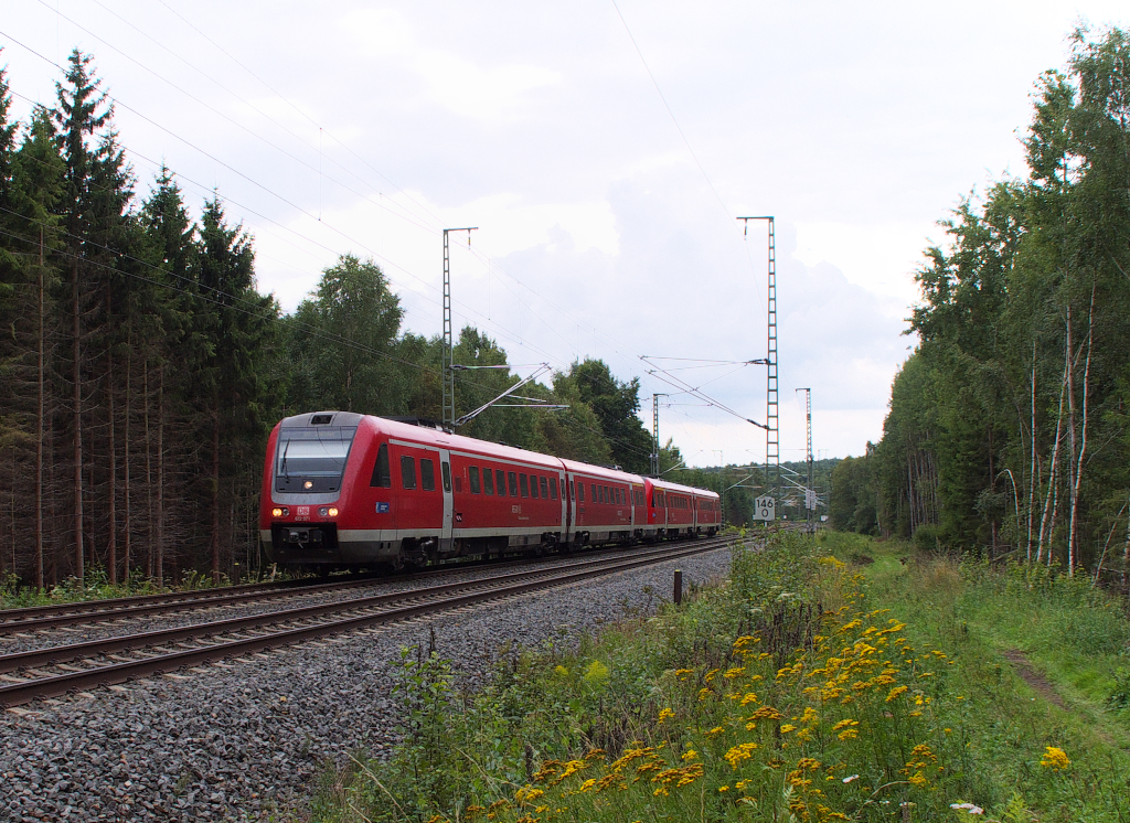 Ein 612er Doppel ist als RE Nürnberg - Dresden zwischen Kornbach und Schönberg unterwegs und kann es nun etwas lockerer angehen lassen, denn der Scheitelpunkt der Strecke wurde bei Reuth überwunden.