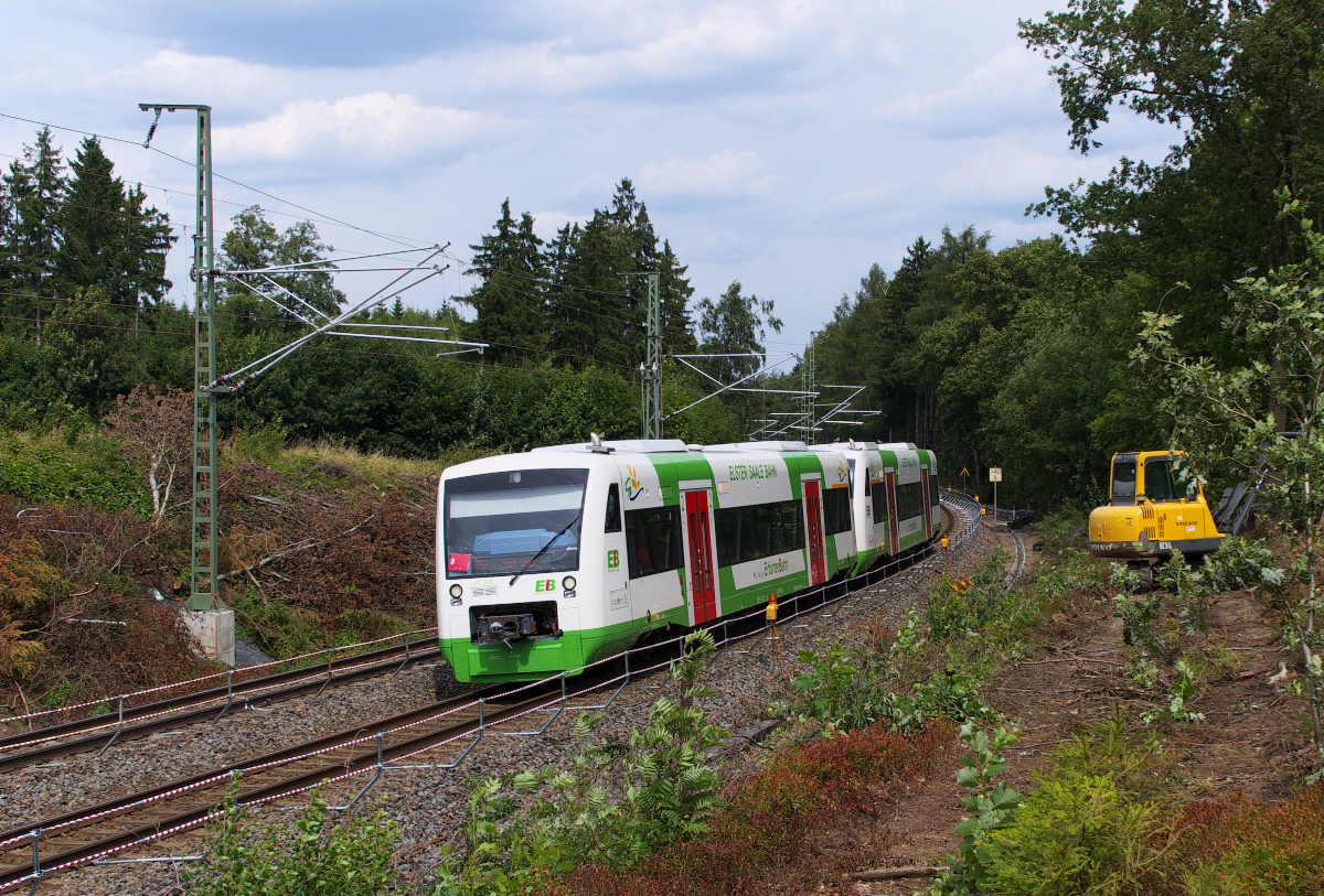 VT 303 und VT 332 der Erfurter Bahn erklimmen nun die Steigung nach Reuth, dem Scheitelpunkt der Strecke. An dieser Stelle einen Gruß an die freundlichen Triebfahrzeugführer der Erfurter Bahn! Erhard Pitzius