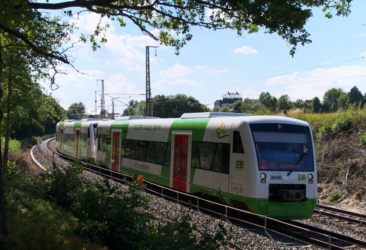 VT 309 der Erfurter Bahn befährt die "Elster Saale" Bahn zwischen Gera (an der Weißen Elster) und Hof (an der Sächsischen Saale).