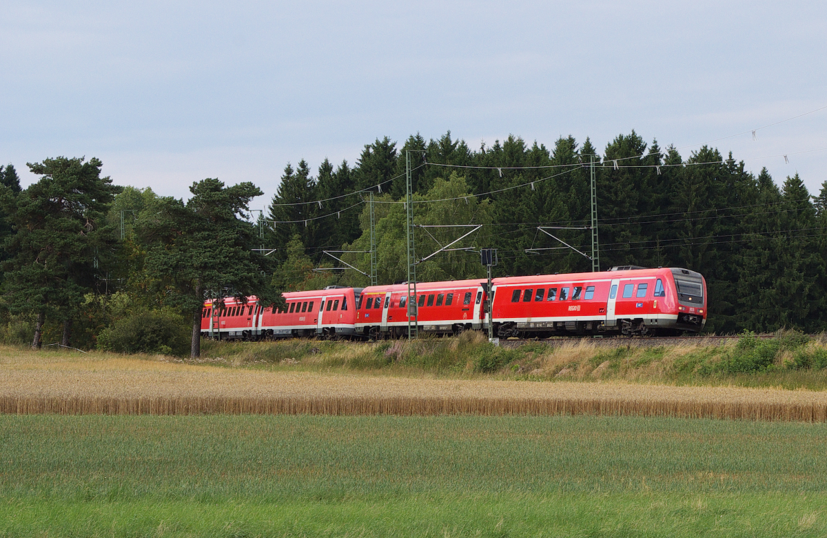 Ein 612er Doppel ist als RE Nürnberg - Dresden bei Kornbach unterwegs und kann es nun etwas lockerer angehen lassen, denn der Scheitelpunkt der Strecke wurde bei Reuth überwunden.
