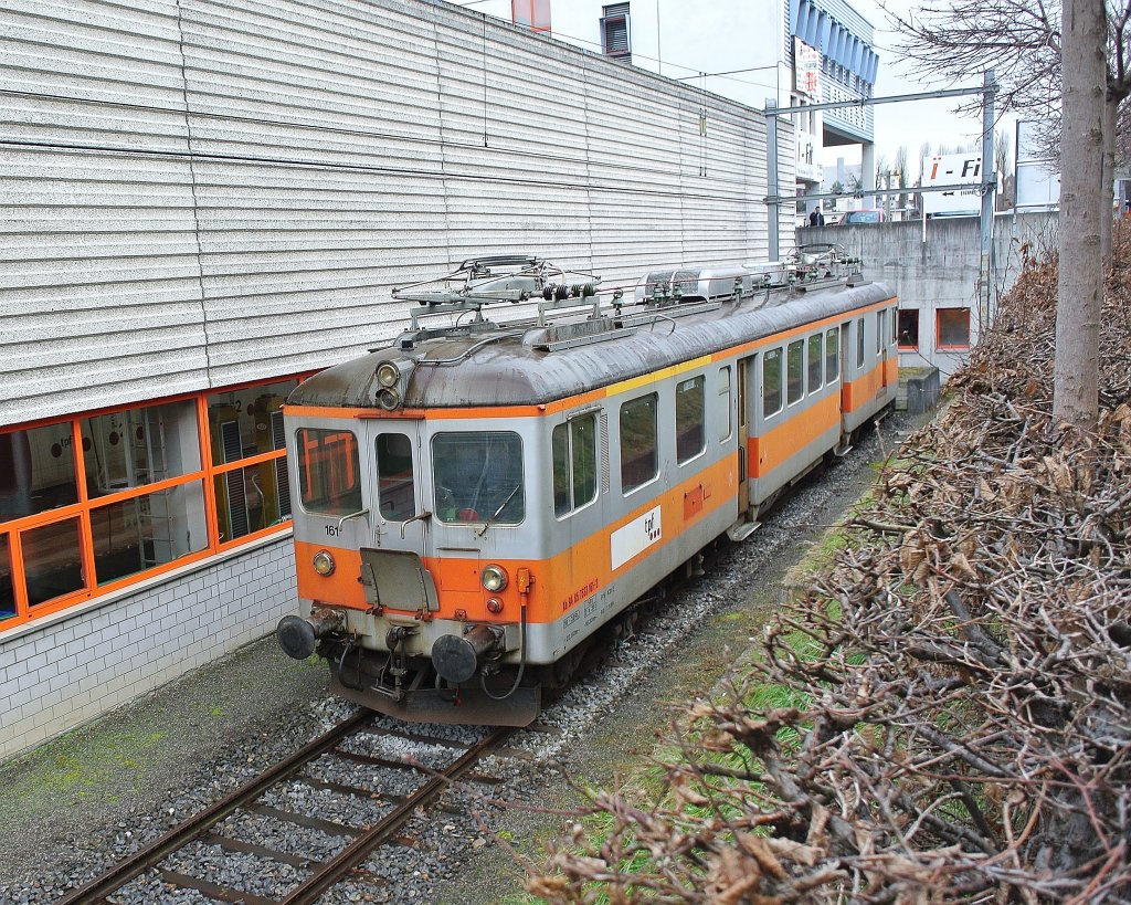 Der TPF, Ex. GFM, Triebwagen, Xe 94 85 7537 161-2 (Dienstbezeichung, da nicht mehr im Personentransport eingesetzt), wartet am 03.01.2013 hinter dem Depot in Fribourg auf sein weiteres Schiksal. Der Triebwagen ist einer von 7, welcher in den Jahren 1946-1948 gebaut wurden. In Betrieb gesetzt wurde er als ABe 4/4 161. In den 60er Jahren wurden 5 dieser Triebwagen zu ABDe umgebaut (ein D Abteil wurde eingebaut). Die Triebwagen wurden nach und nach verschrottet. Dank der Verwendung als Dienstriebwagen ist er bis heute noch erhalten gebliegen. Simon Bütikofer