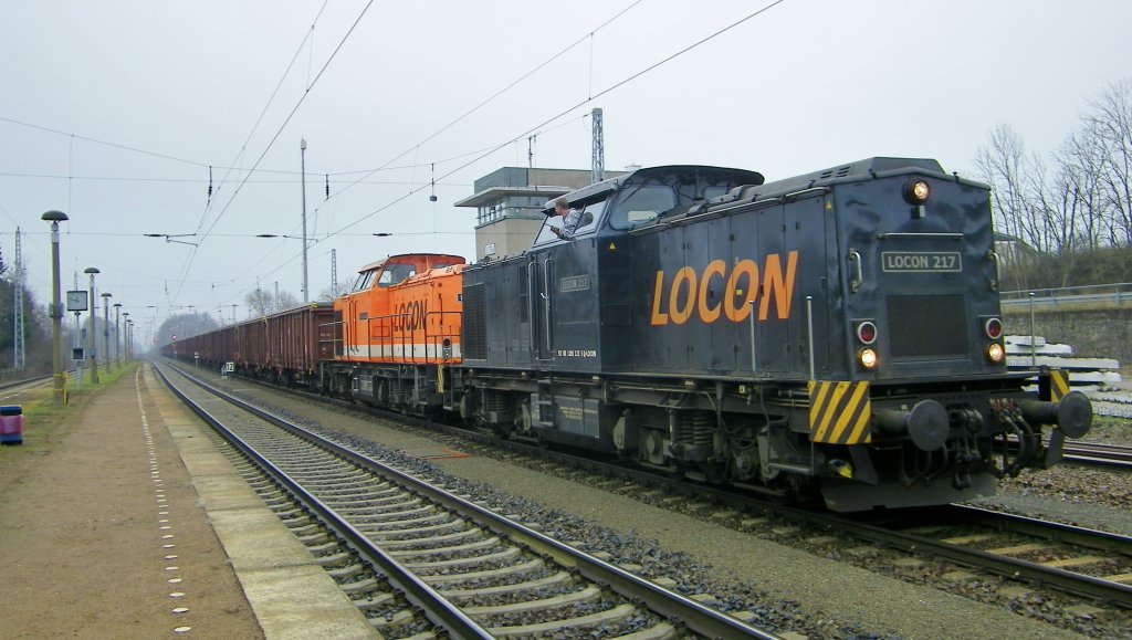 2x V 100 mit LOCON 216 + 217 schieben einen langen Zug aus leeren Kalk-Waggons hinein in das Anschlußgleis des Kalkwerk Ostrau (Sachsen), 08.03.2013 Silvio Hass