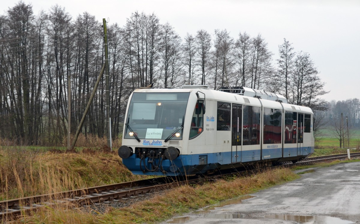 654 014 der Rurtalbahn ist fernab der Heimat für Vetter-Bus auf der Strecke Lutherstadt Wittenberg - Bad Schmiedeberg im Einsatz. Am 08.12.2013 hat der Zug gerade den BÜ Korgauer Straße überquert und in Kürze am Haltepunkt Bad Schmiedeberg Kurzentrum enden. Christopher Pätz