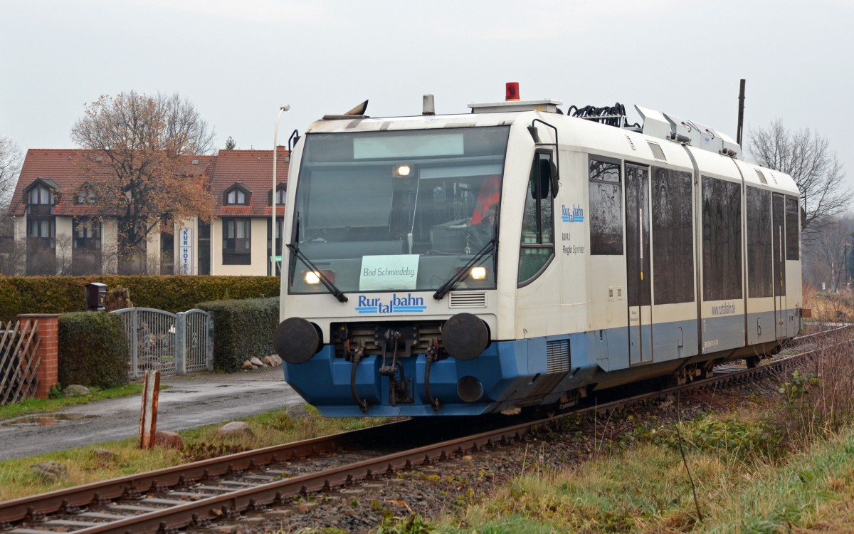 Die von Wittenberg ausgehende Strecke nach Bad Schmiedeberg wird vom Busunternehmen Vetter mit Triebwagen bedient. 654 014 der Rurtalbahn passiert am 08.12.13 die Schmiedeberger Kurklinik und wird gleich den gleichnamigen Endhaltepunkt erreichen. Martin Schneider