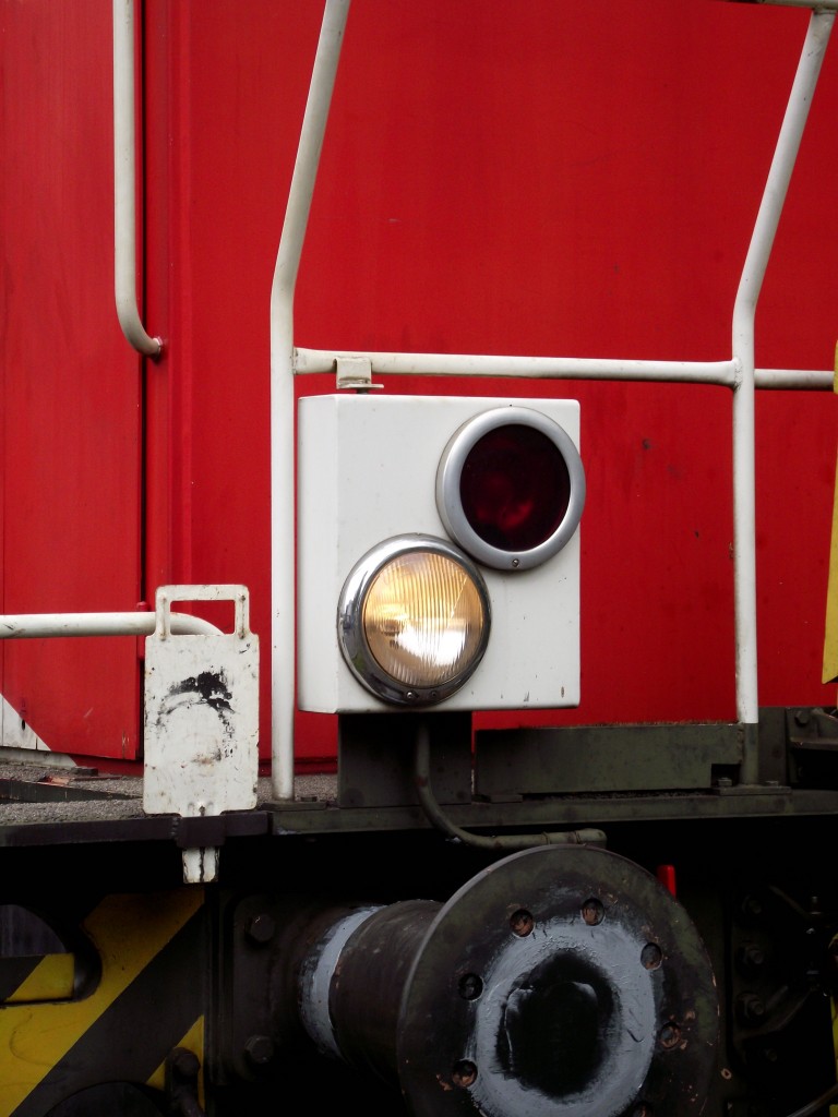 Detailfoto eines Scheinwerfers einer Diesellok der Firma BBL-Logistik. Die Glühbirne mit dem alten B22d Bajonettsockel ist gut erkennbar. 28. Mai 2013. Julian