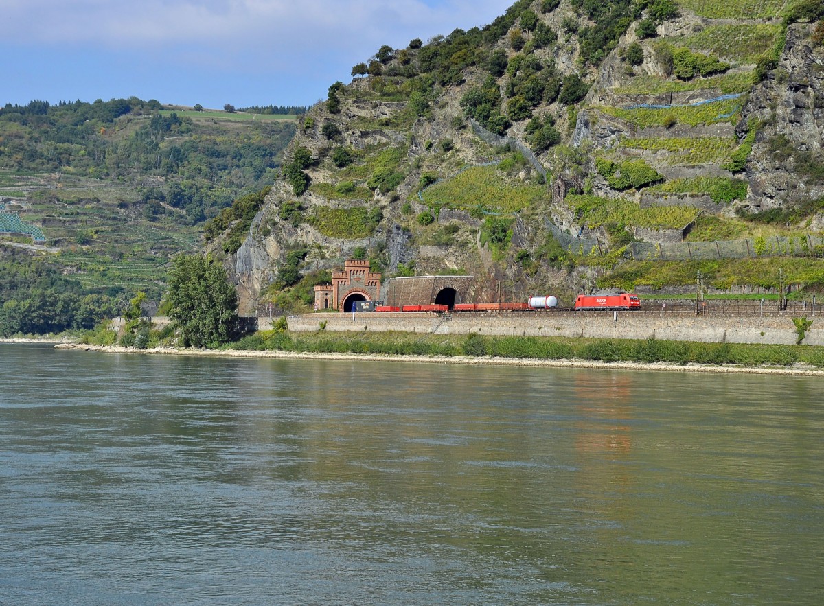 185 305 ist mit einem gem.GZ auf der rechten Rheinseite in Richtung Rüdesheim am Rhein unterwegs.Das Bild entstand in Oberwesel und zeigt die Tunnelausfahrt auf der rechten Rheinstrecke kurz vor Kaub.Aufgenommen am 1.10.2013 Daniel Powalka