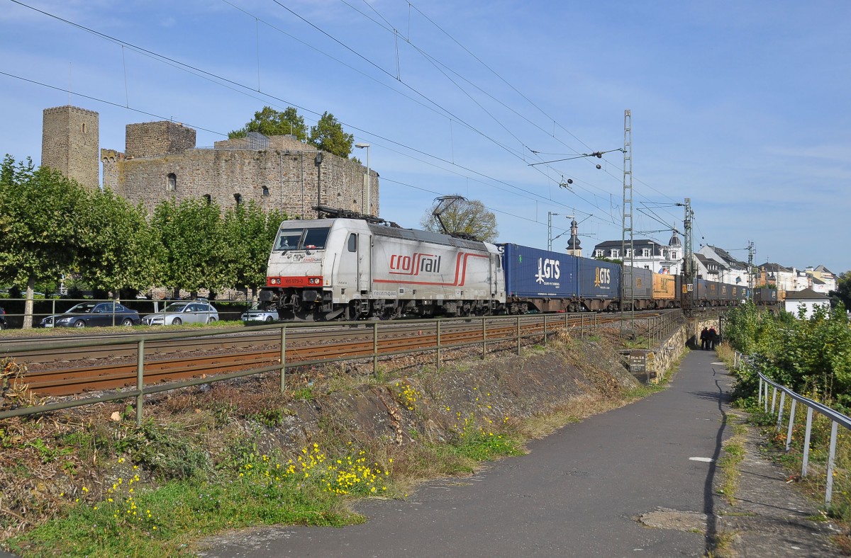 185 579 CROSSRAIL mit einem Container Zug auf der rechten Rheinseite Richtung Köln.Aufgenommen im Bahnhof Rüdesheim am Rhein am 3.10.2013 Daniel Powalka