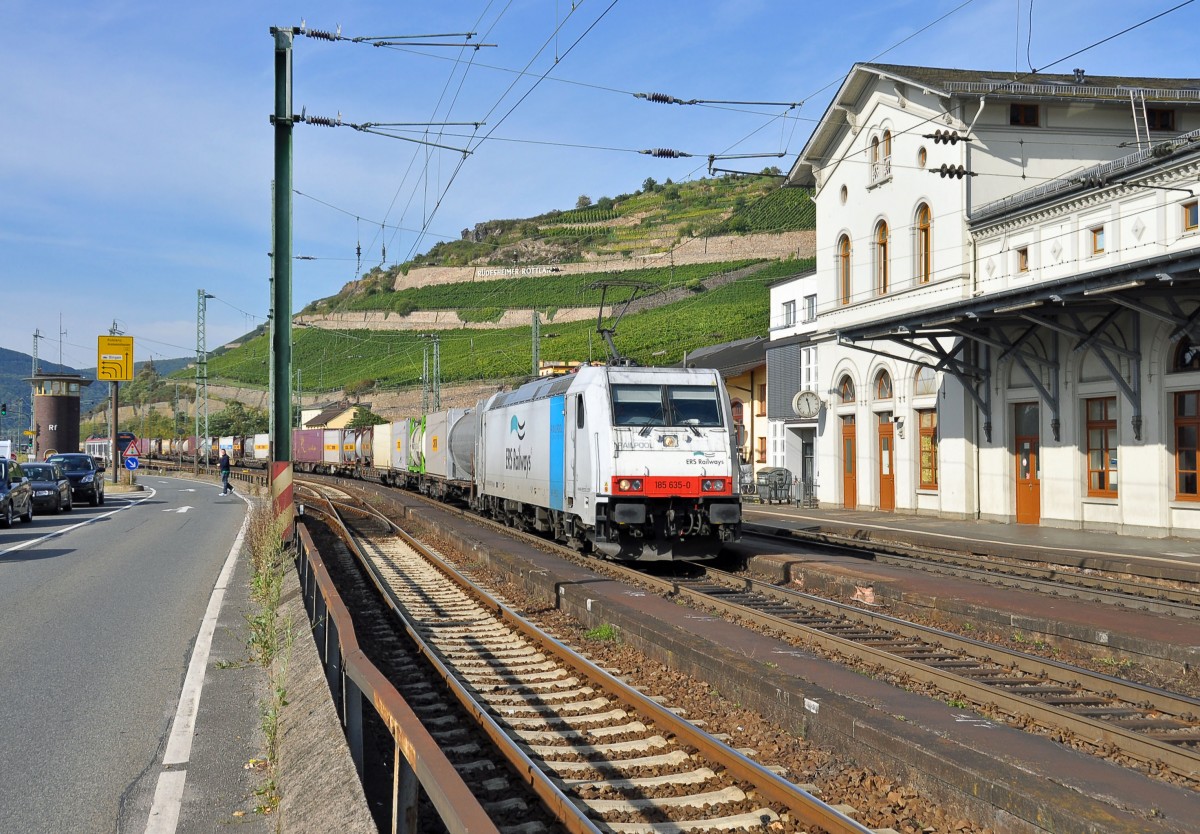 185 635 unterwegs für ERS mit einem Containerzug Rechtsrheinisch in Richtung Wiesbaden.Bild Aufgenommen im Bahnhof Rüdesheim am Rhein am 3.10.2013 Daniel Powalka